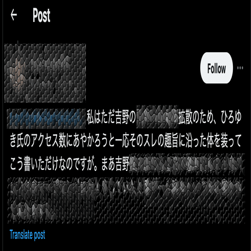 後にAが自身のツイッターに「アクセス数のある有名人のコメント欄で一応スレの趣旨に沿った体を装って拡散行為をしている」といった趣旨の事を投稿した事を考えると、どんな手を使ってでも当方への嫌がらせを拡散したかったのだろう。