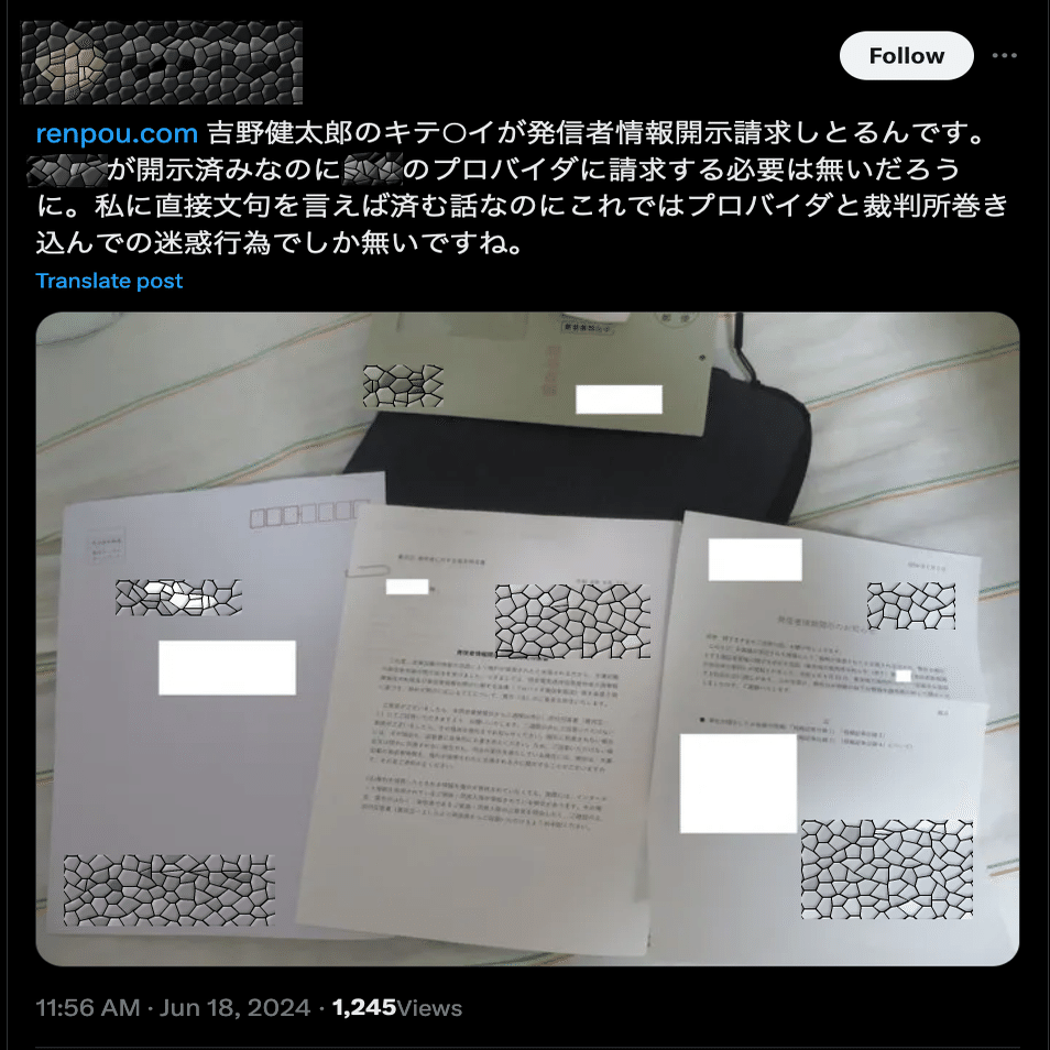 この新たに判明した地域密着型のプロバイダーへ対し、2023年6月に信者情報開示請求の手続きをしたところ、Aはプロバイダーから届いた書面の写真と共に、当方をツイッター上で「キテ○イ」呼ばわりしはじめた。