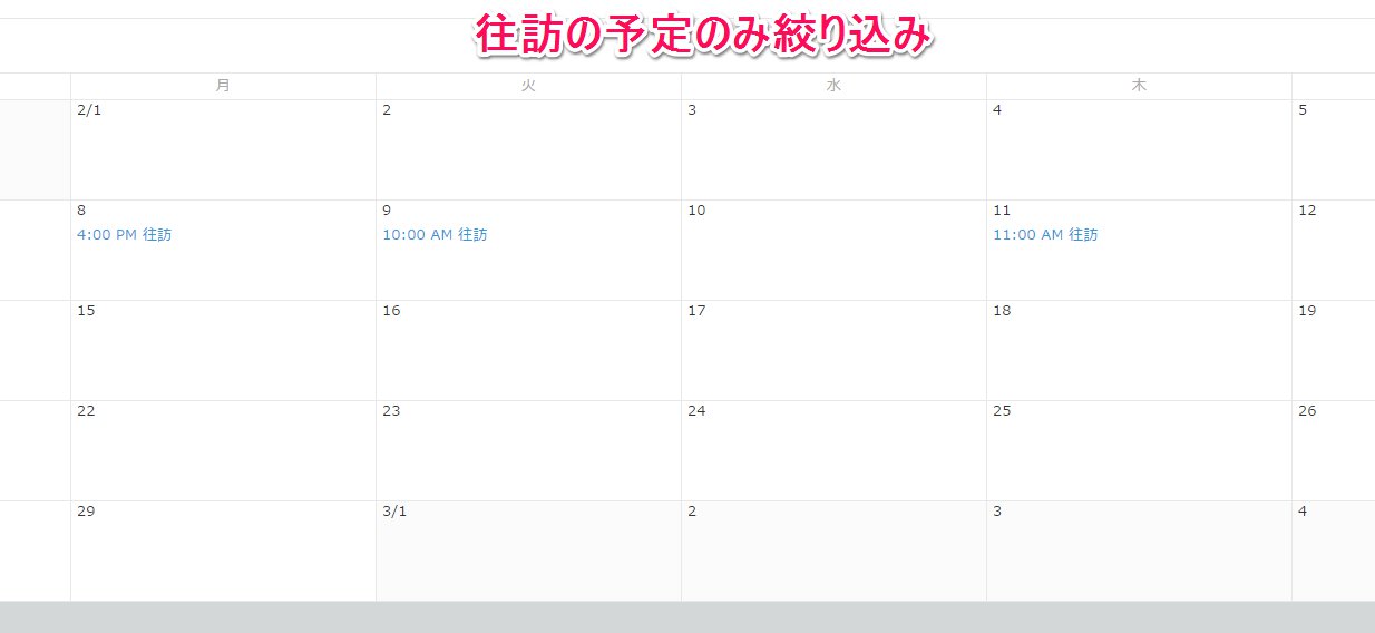 これは表形式での機能にもありますが、「絞り込み」で条件を設定することで、カレンダー上に表示するタイトルの表示/非表示を設定出来ます。往訪の予定だけ表示、会議の予定だけ表示ということもできます。