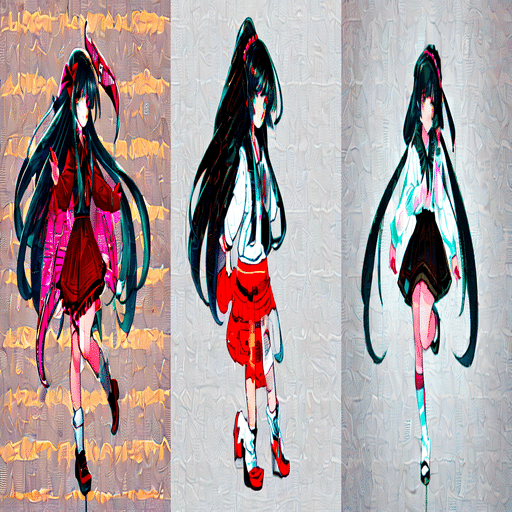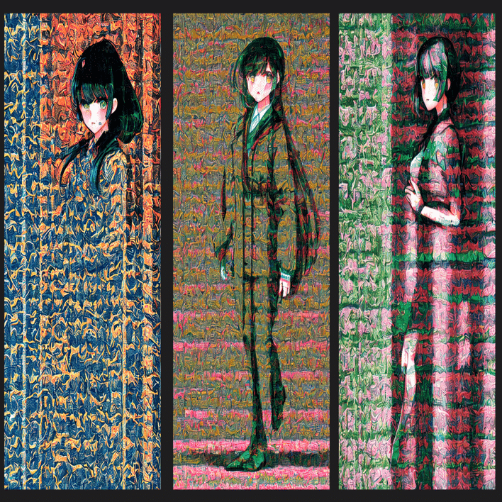 キャラクターや風景の模倣自体は一定できているように見えますが、全体的にノイズが目立ち、絵が崩れてしまっていることが分かります。(キャラクターの顔や体が多少歪んでいるようにも見えますが、プロンプトの影響の可能性もあり、ここでは無視いたします。)