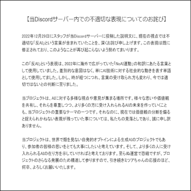 「反AI」という単語が現在のような蔑称扱いになったのは、反AI自身の行動・言動の積み重ねにより、単語のイメージが著しく悪化したのが原因であり、今回問題となっている2022年12月29日の時点ではまだ蔑称ではなかったのだが、ミツア公式は「現在の視点では不適切な単語が使用されていた」として謝罪、削除した。