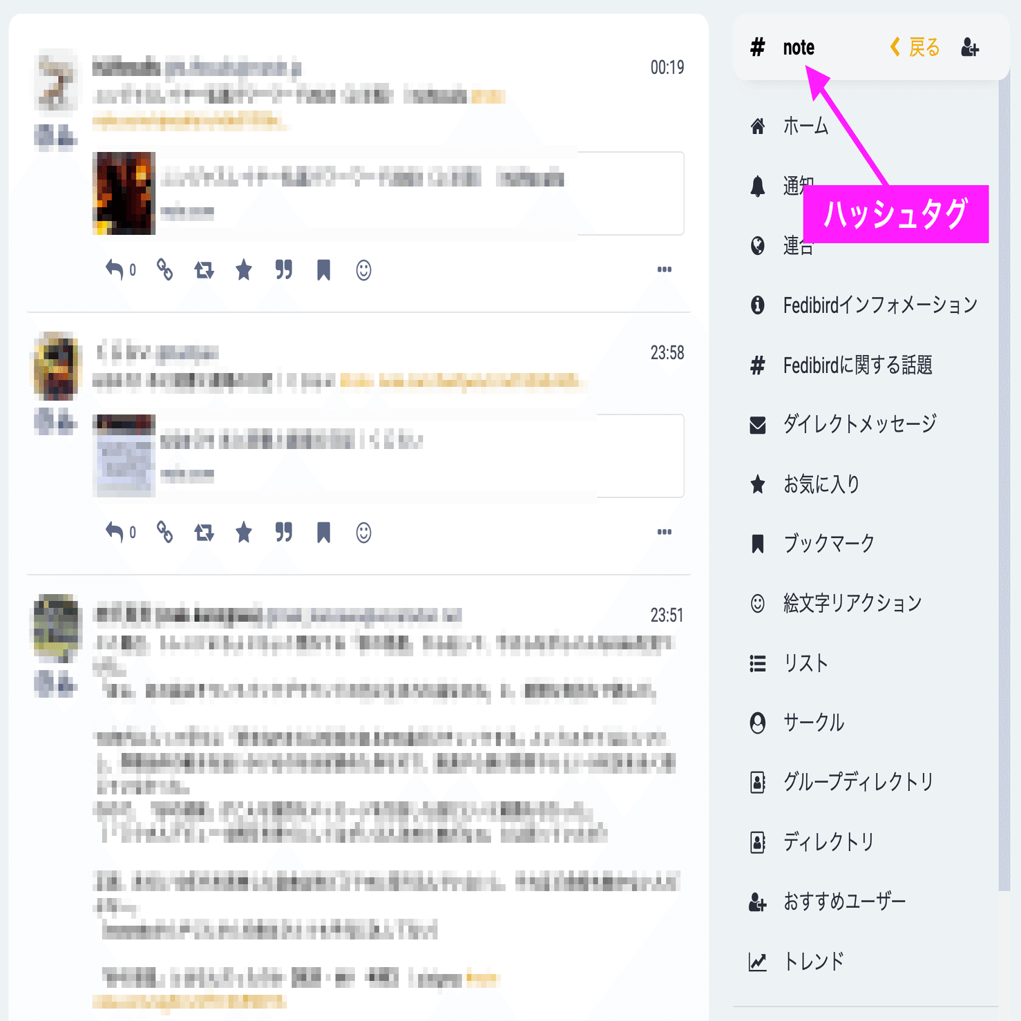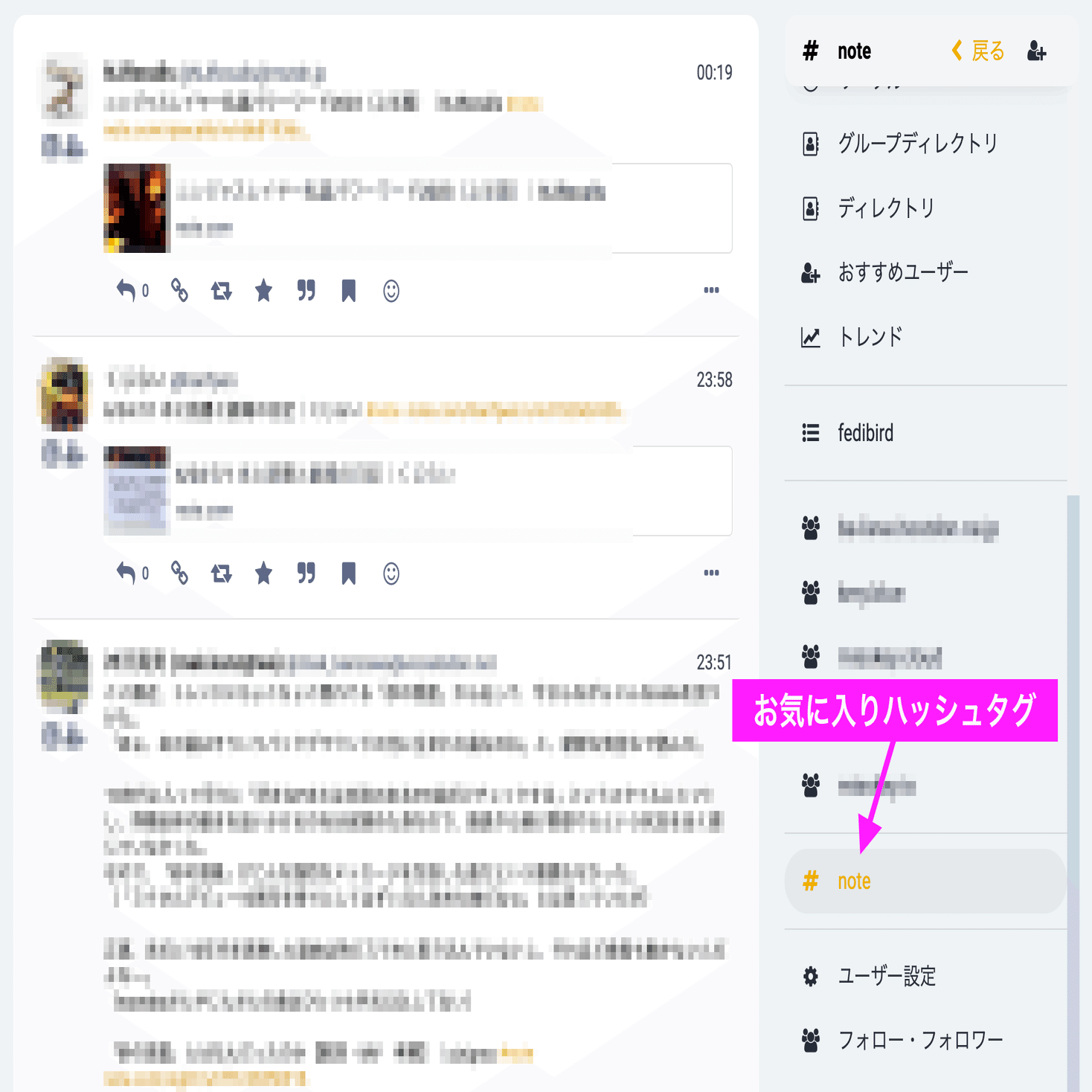 Fedibirdでは、指定したハッシュタグを「お気に入りハッシュタグ」として登録することで、メニューからそのハッシュタグのタイムラインを開くこともできます。