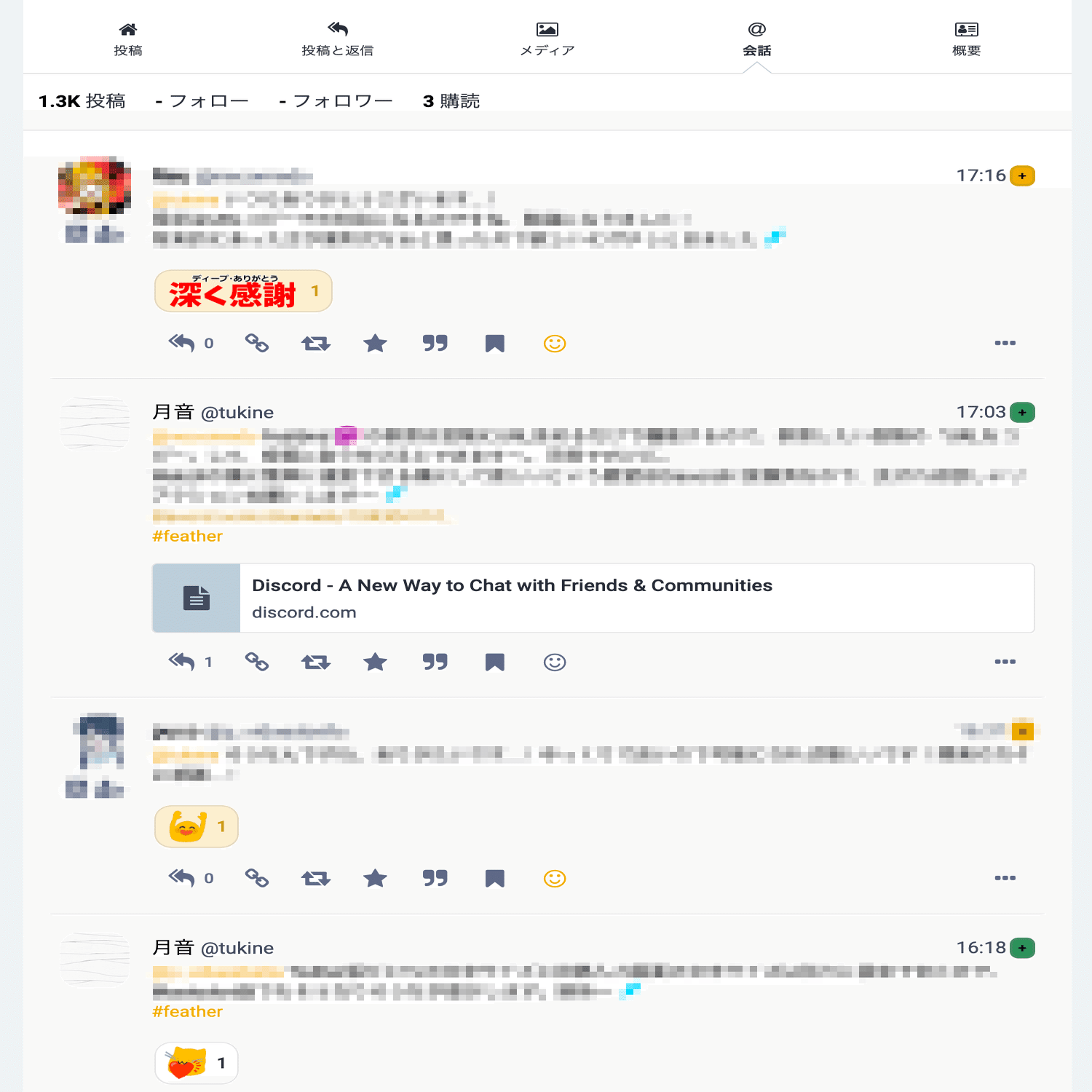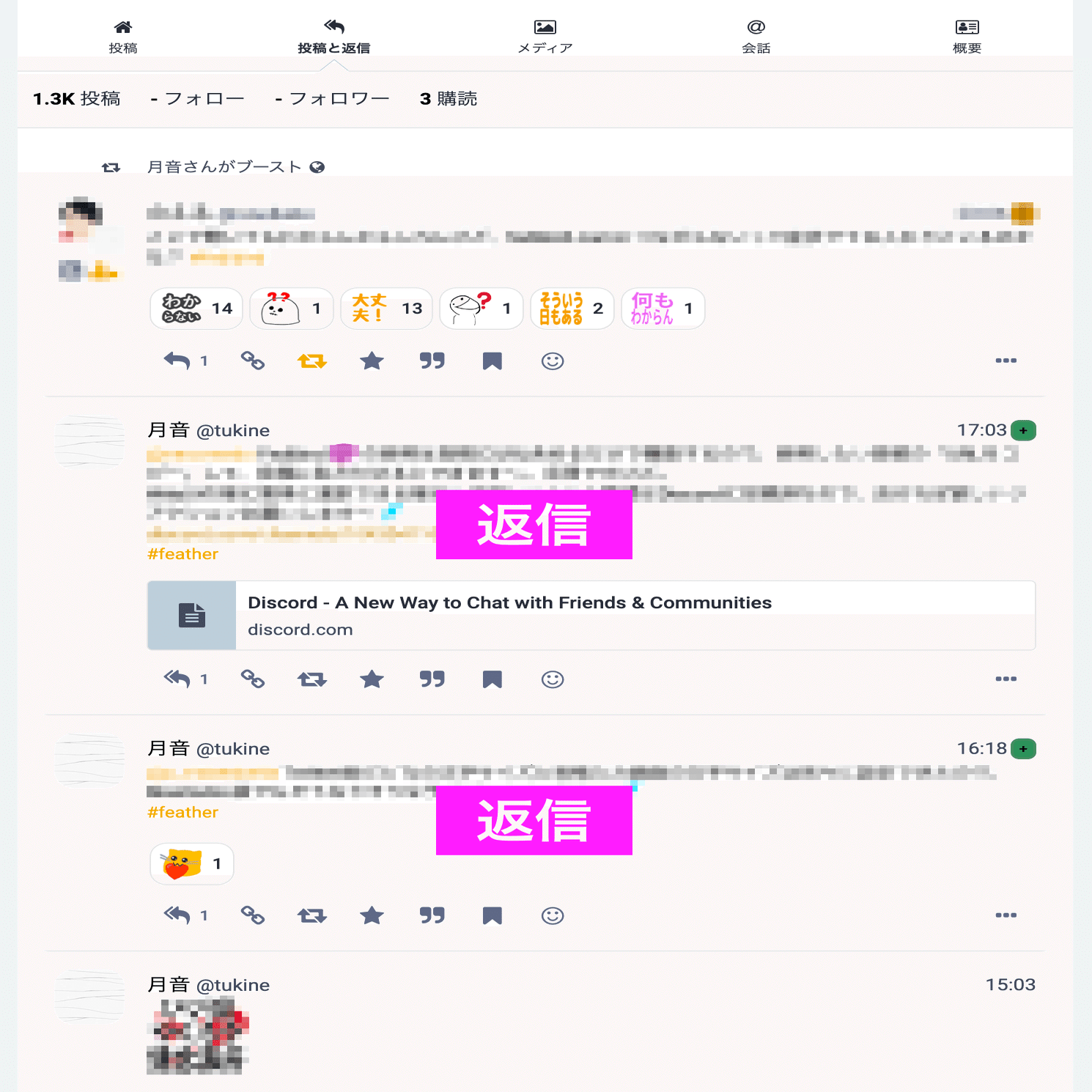 ユーザーの投稿とブーストに加え、返信の投稿も表示されます。