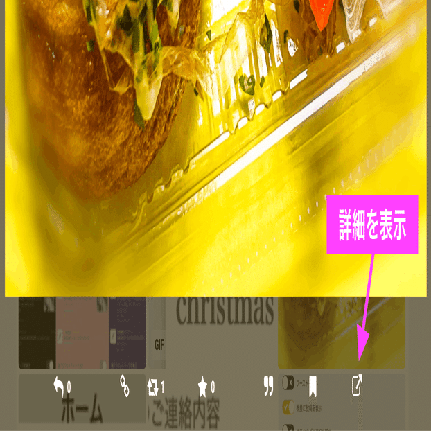 拡大表示されたメディアの下に並んでいるアクションの右端にある「詳細を表示」ボタンから、そのメディアが添付された投稿に移動できます。