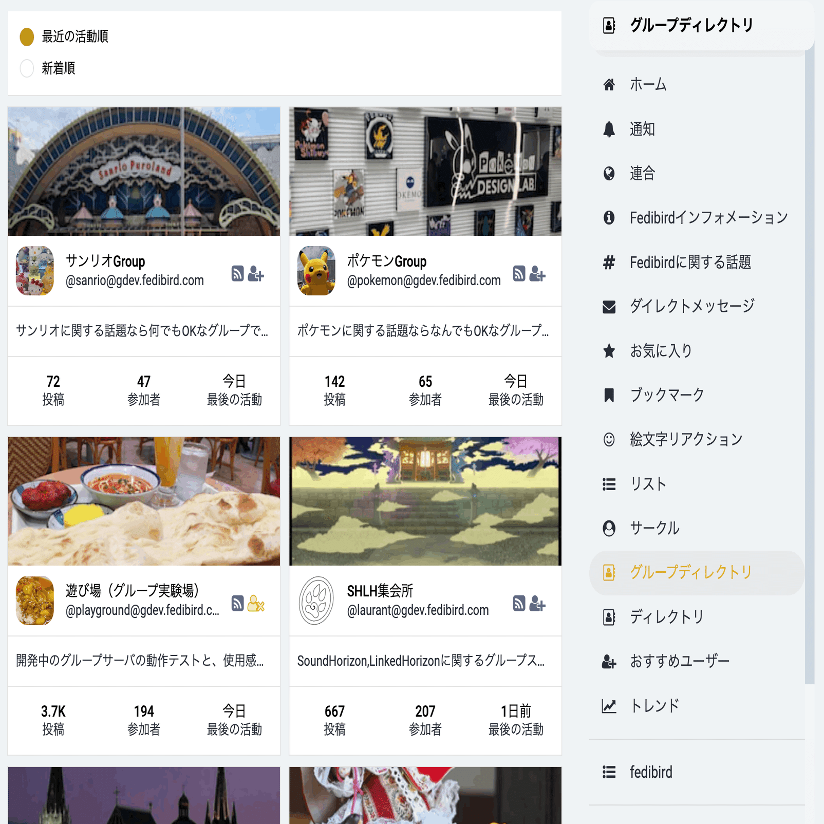 Fedibirdでは、「グループディレクトリ」メニューからグループアカウントを検索することができます。