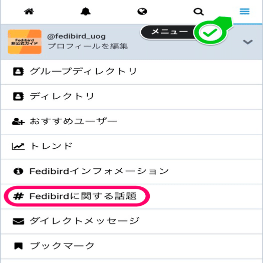 メニューにある「#Fedibirdに関する話題」から開きます。