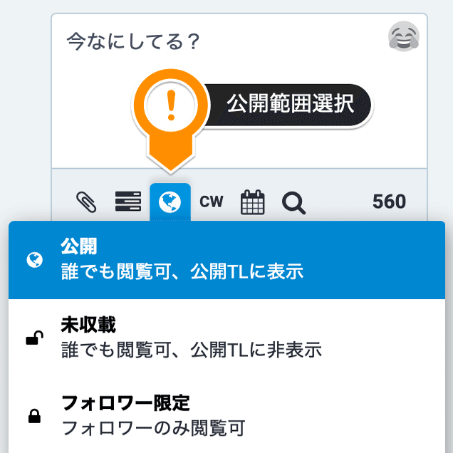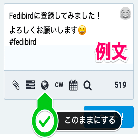 そして、もしよかったら#fedibirdタグを付けて初めましての挨拶を投稿してみてください。この時、投稿入力欄下の左から3番目にあるアイコンは地球🌏のままにしてください。