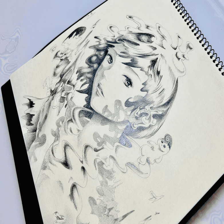 やってみます!とすぐさま取りかかった理由。それは、手元にあったスケッチブックから例によって「はい、ワタシ出演します」と名乗り出る声が聞こえたからだ。ページを開くと、そこには数日前に描いたドローイングがあった。私は「この絵や.....!」と直感し、降りてきたイメージを掴み、デスクで深呼吸。紙、鉛筆、ペン、Photoshop..といった道具たちと相談。ゴールをイメージし、それに向かう創作フローを脳内トレース。あとは考えずにひたすら描いていき、プロトタイプが完成した。