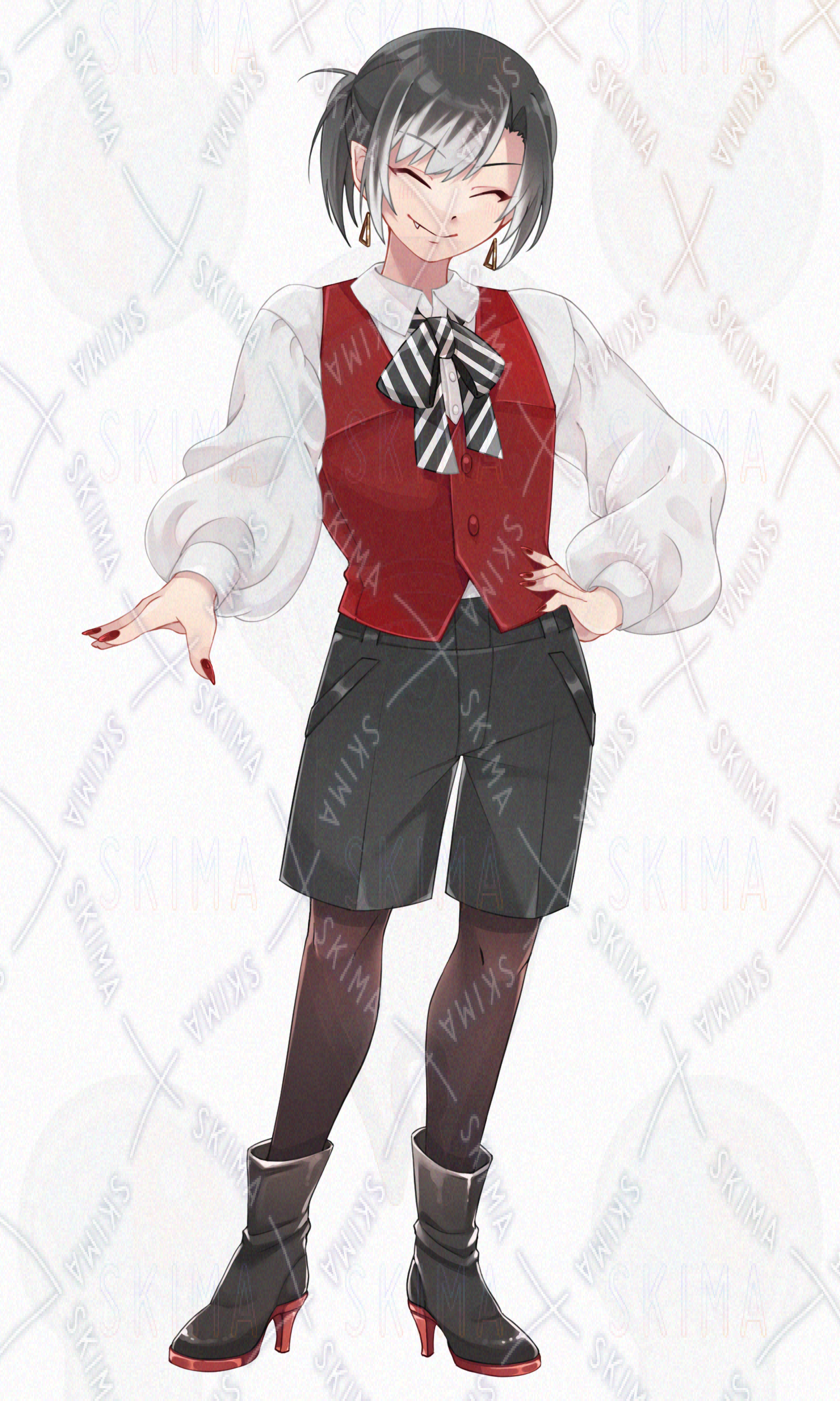立ち絵/TRPG/少年/男の子/かわいい/かっこいい/赤目/赤眼/吸血鬼/ヴァンパイア/マント/貴族/長髪/ポニテ/ポニーテール/黒髪/メッシュ/モノクロ/モノトーン/赤/リボン/ベスト/スーツ/ブーツ/ヒール/タイツ/ブラウス/白/黒/つり目/人外/ボーダー/