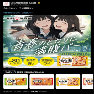 2024年12月6日、UHA味覚糖が、Twitterにおいて、同社製品である「満足バー」の広告を展開。