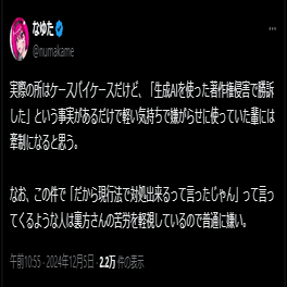 2024年12月4日、長らく反AI絵師として活動している裏方(id:urct)氏が、何かに勝訴した事を公表。