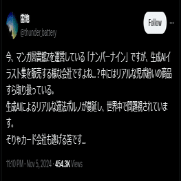 今回も反AIの雷池が「マンガ図書館Zがサービス終了になったのは運営会社がAI生成コンテンツを取り扱っていたからだ」というデマをツイートして攻撃。