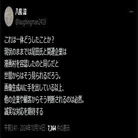 2024/10/13、集英社とバンダイナムコが、スマホ向けアプリ「ONE PIECE BASE」をリリース。その中に、任意の写真を尾田栄一郎風のイラストに変換する「ONE PIECE 似顔絵メーカー」という機能が存在。それが生成AI技術を使用しているとして、反AIが群がり、焼かれる。