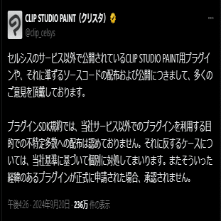 同日、クリスタの開発元であるセルシス社が声明を発表。「野良プラグインを使って何が起きても知りません、申請が来たら審査はする」とだけ言えば良かったものを、変に反AIの顔色を伺って「承認されません」などと書いた事で、状況が余計に悪化した。