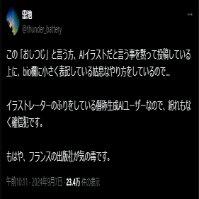 この話はその後「TwitterのポストにAIタグを付けるか否か」という本件と関係ない話にズレて行った。それらも「出版社が騙された」というデマをベースにしている。