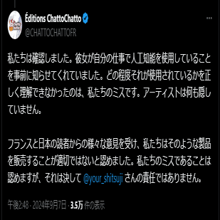 これらのイラストは、ChattoChatto社が自力で作成したものではなく、「おしつじ(@your_shitsuji)」氏に依頼して納品させたものであるため、反AI的には「フランスの出版社が手描き詐称のAI野郎に騙された」というストーリーになっているが、この出版社は納品物がAIを使って作画されている事を元々知っていたので、「手描き詐称」も「騙された」も両方ウソである。