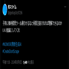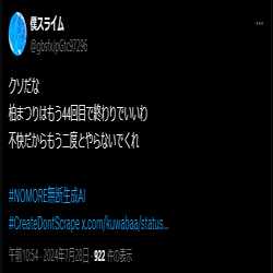 キャンセル成功例。わずかに反AIが群がってきた時点で速攻でTweetを削除。あまりに消すのが早かったので元Tweetを参照できなかった。下記画像はキャッシュから発掘したもの。
