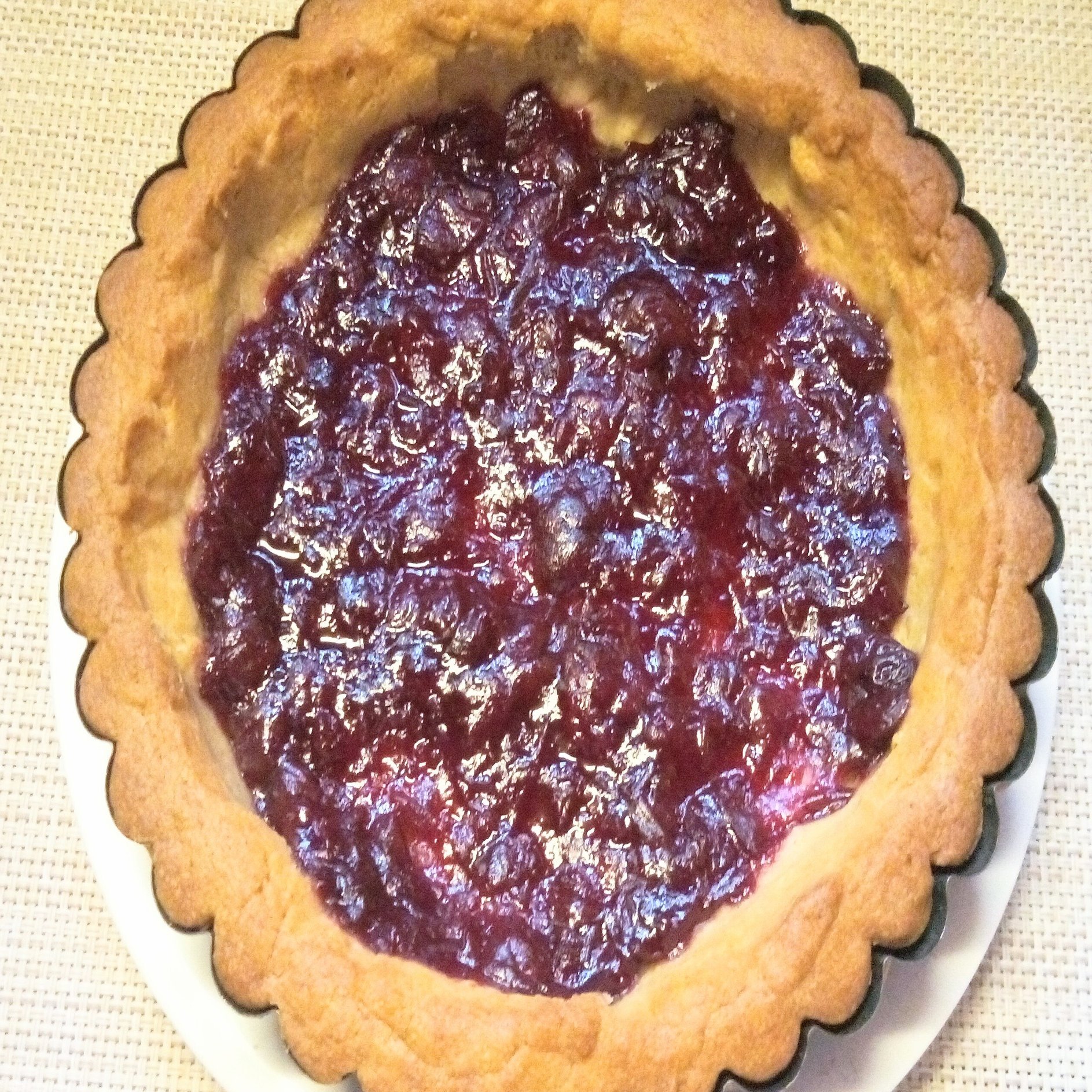 ドライチェリーが無く、Kaldi のチェリーコンポートにキルシュを入れて生地に塗りました。タルトをカリカリに仕上げたかったので、180℃のオーブンで10分焼いた。