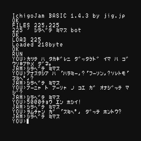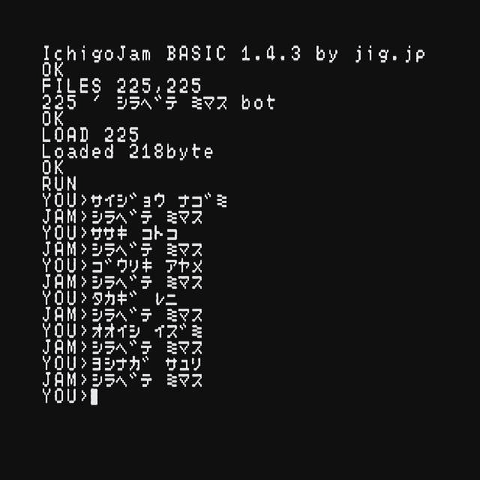 IchigoJam BASIC で、何を言われても「調べてみます」と返すチャットボットのようなものを作ることができた。
