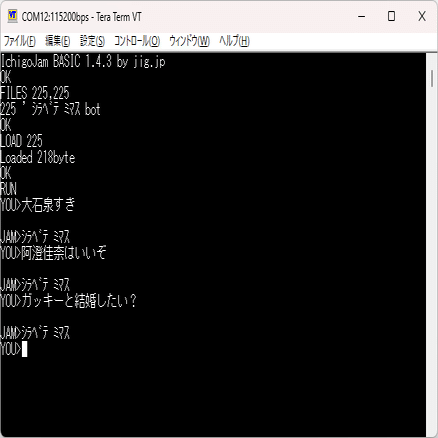 IchigoJam の画面上では文字化けするが、どうせ入力した内容は処理には反映されないので、問題ない。