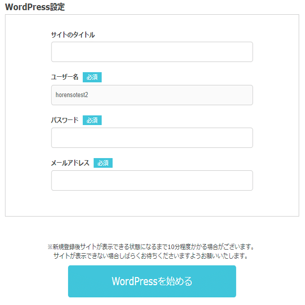 ユーザー名はアカウント名がそのまま使われるようです。ここで改めてパスワードとメールアドレスを聞かれますが、これはWordPressの管理画面にログインするために使用するものです。
