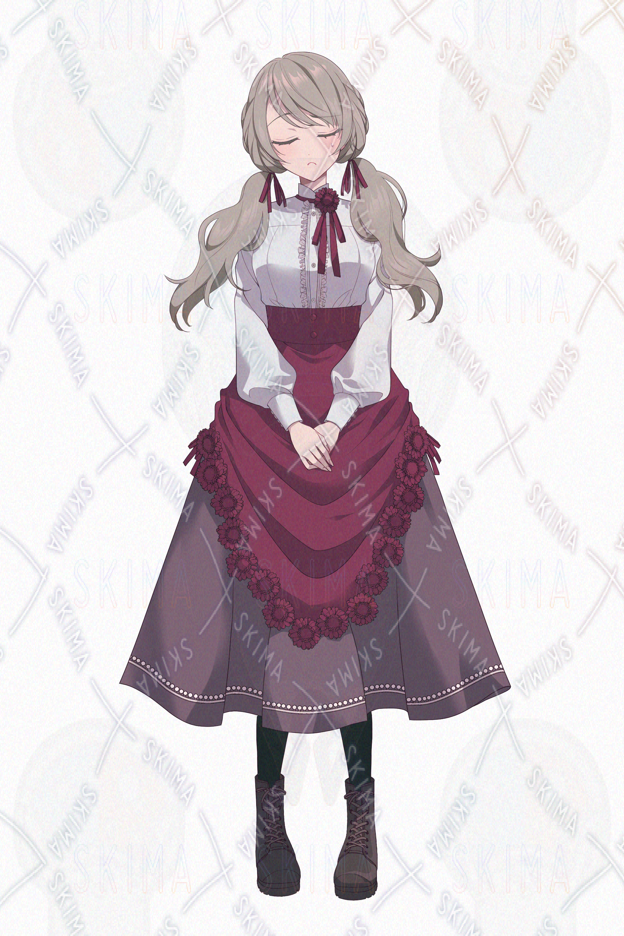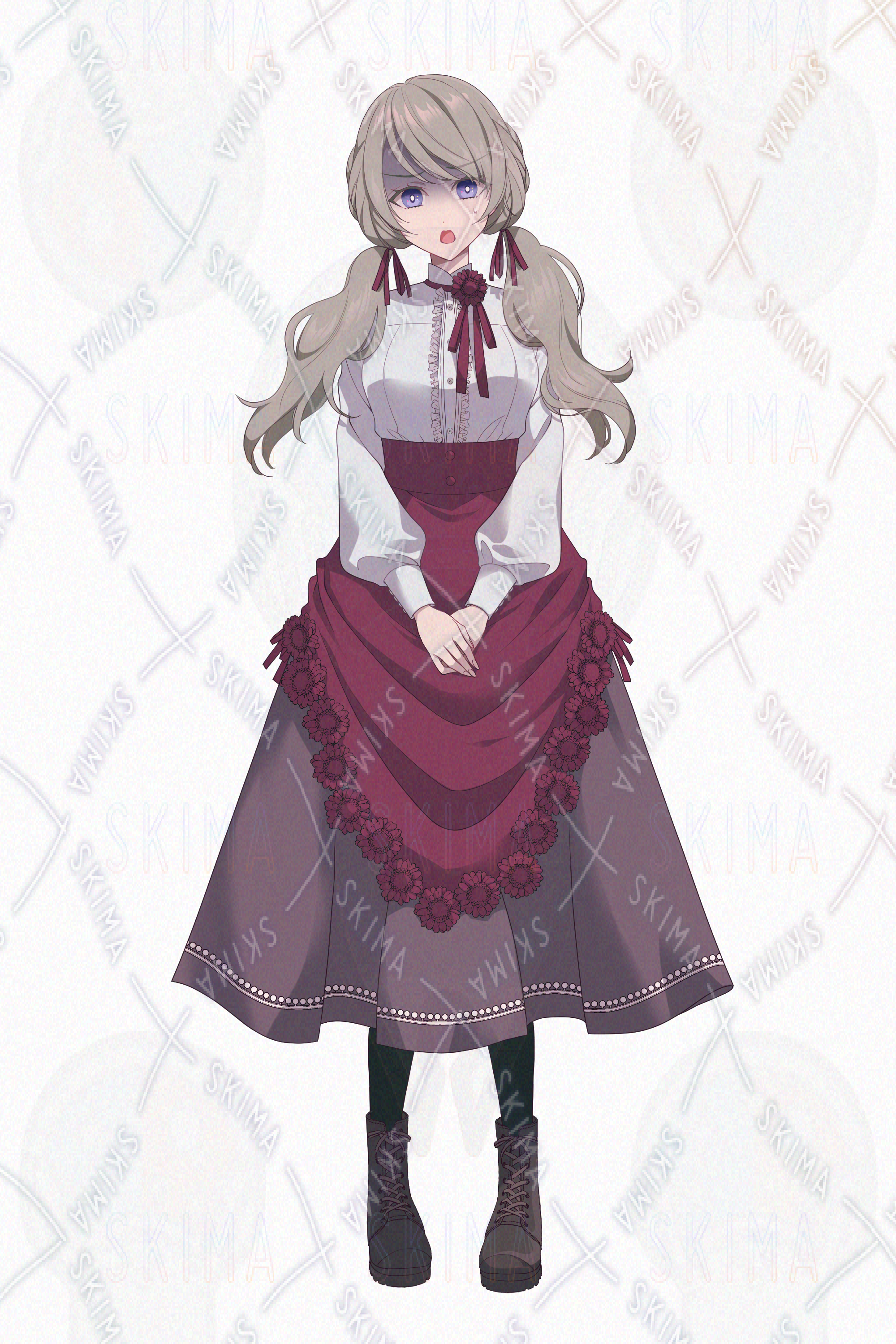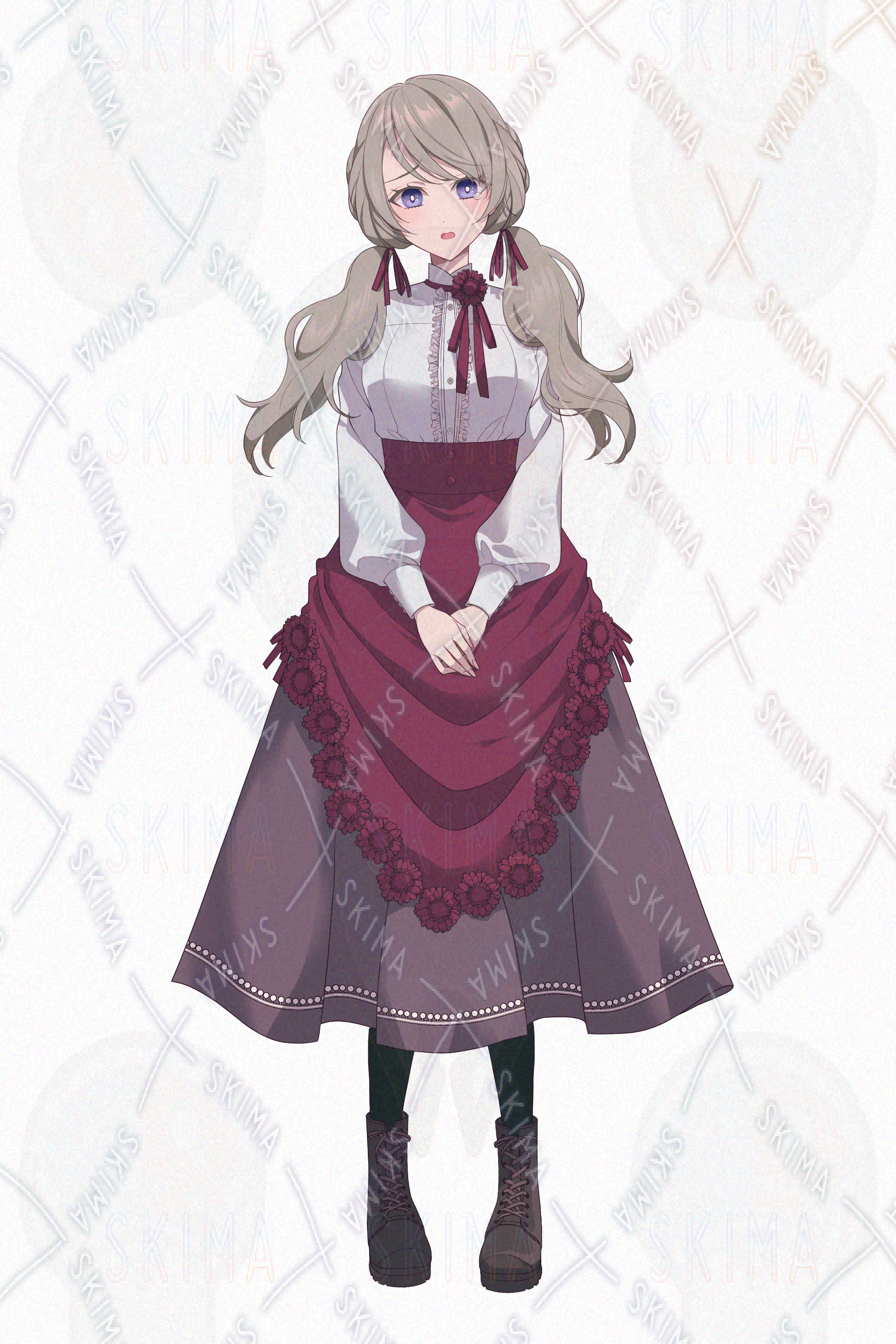 女子、女の子、ツインテール、二つ結び、スカート、髪飾り、花、ブーツ、リボン、ファンタジー、お嬢様、令嬢、赤、臙脂、ワインレッド