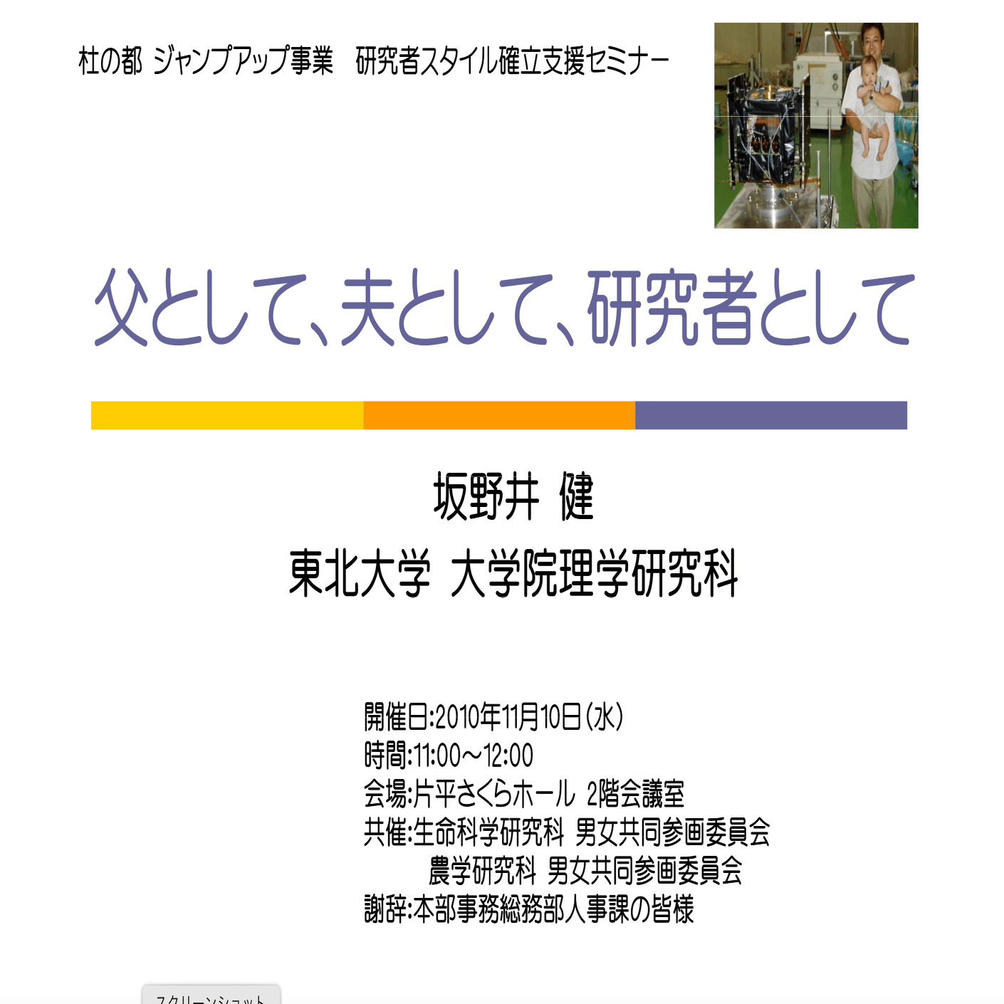 また、本学で長期育児休業を取得した男性のおそらく第一号は、理学研究科准教授の坂野井 健先生であることに触れておきました。下記スライドPDFのリンク先はこちら。