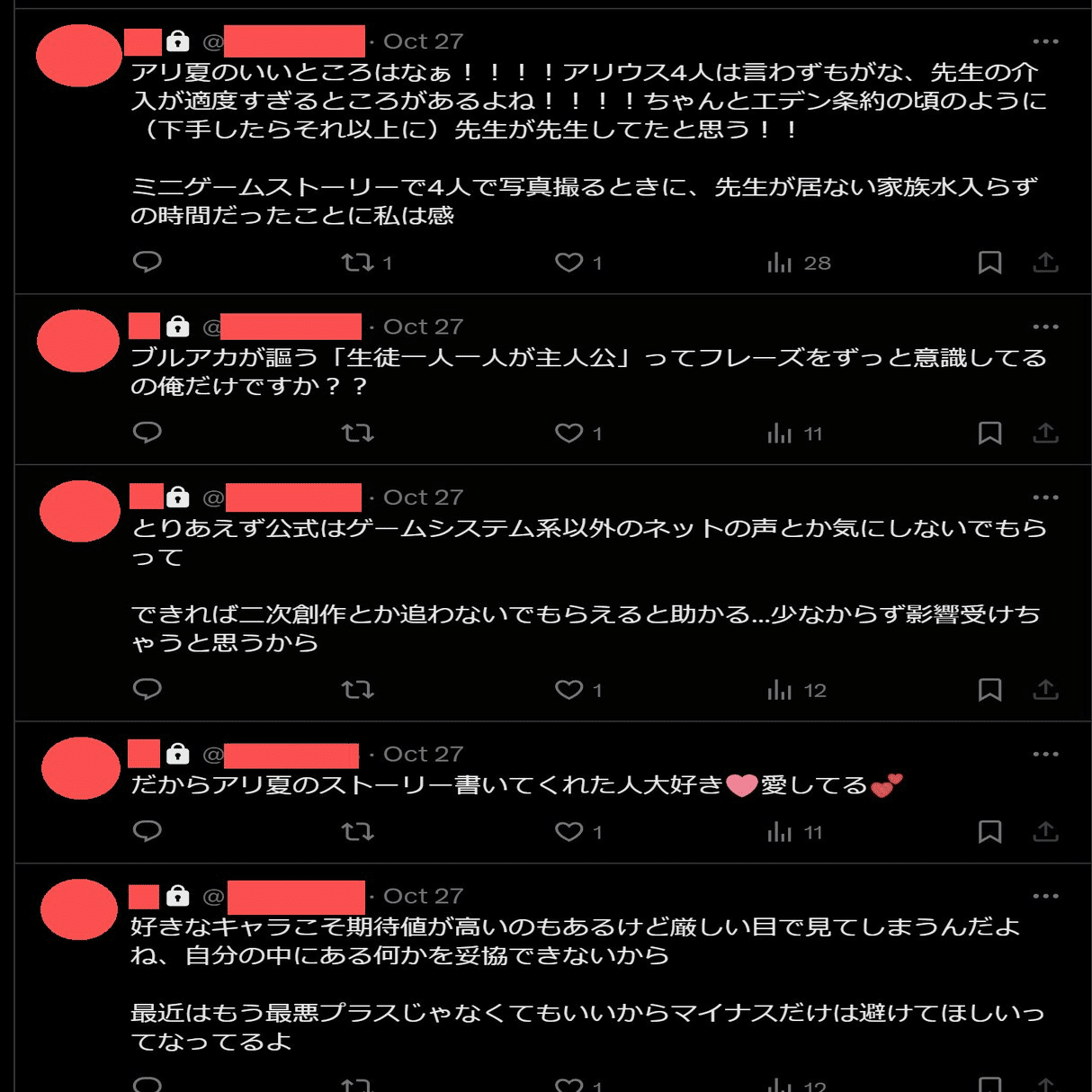 あとは、他人の(その作品への)興味関心、向き合い方、感想、(ブルアカで言うと)絆、総力/大決の順位(これに関しては自分の順位すらどうでもいいのに、他人のとかもっと興味無い)