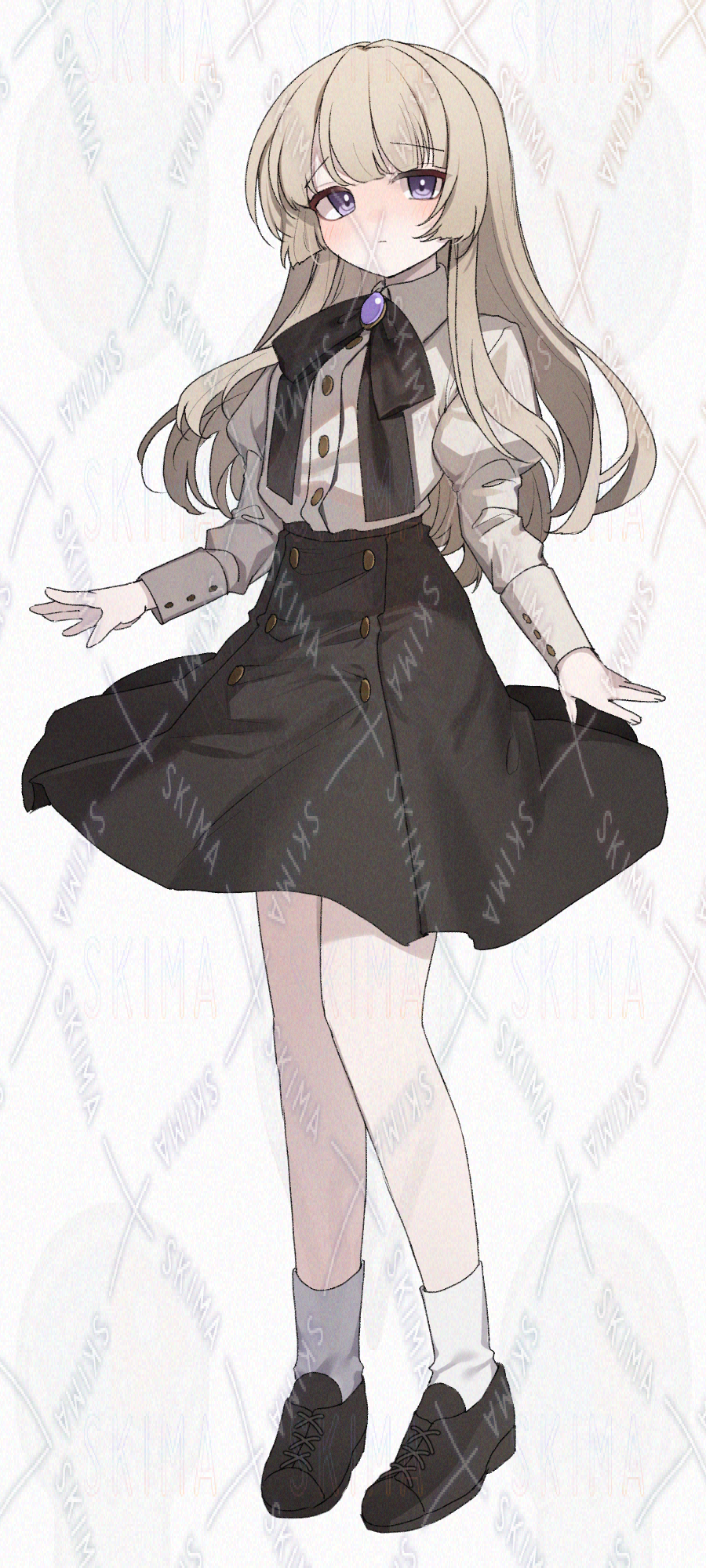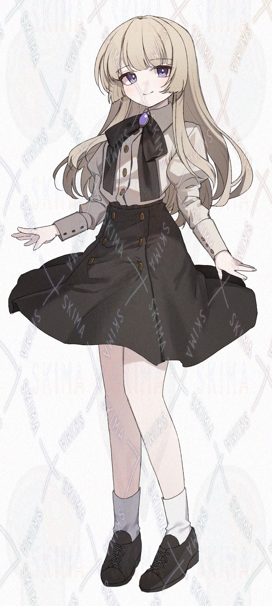 明るい髪色、姫カット、ブラウンのスカートを着た女の子です。キャラ設定はご自由に。