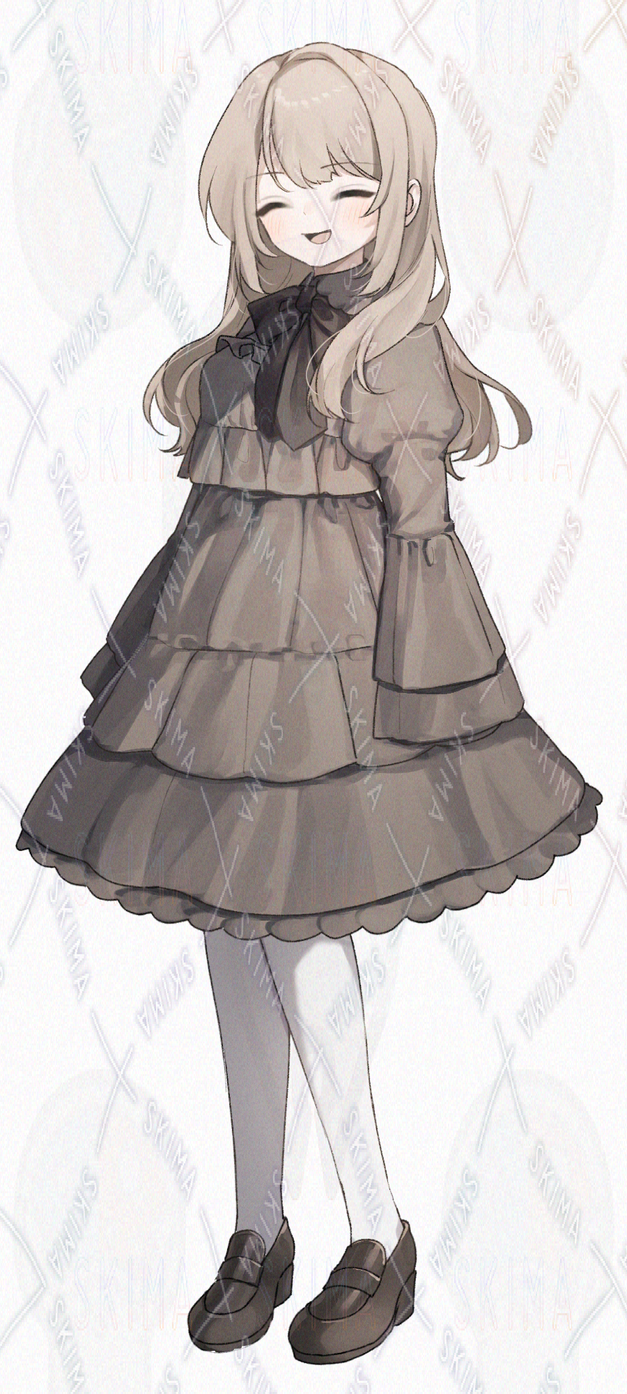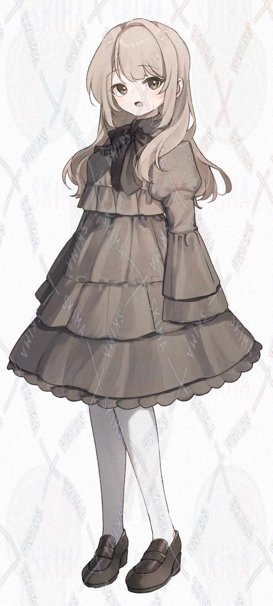 ベージュヘア、ベージュのフリルワンピースを着た女の子です。キャラ設定はご自由に。