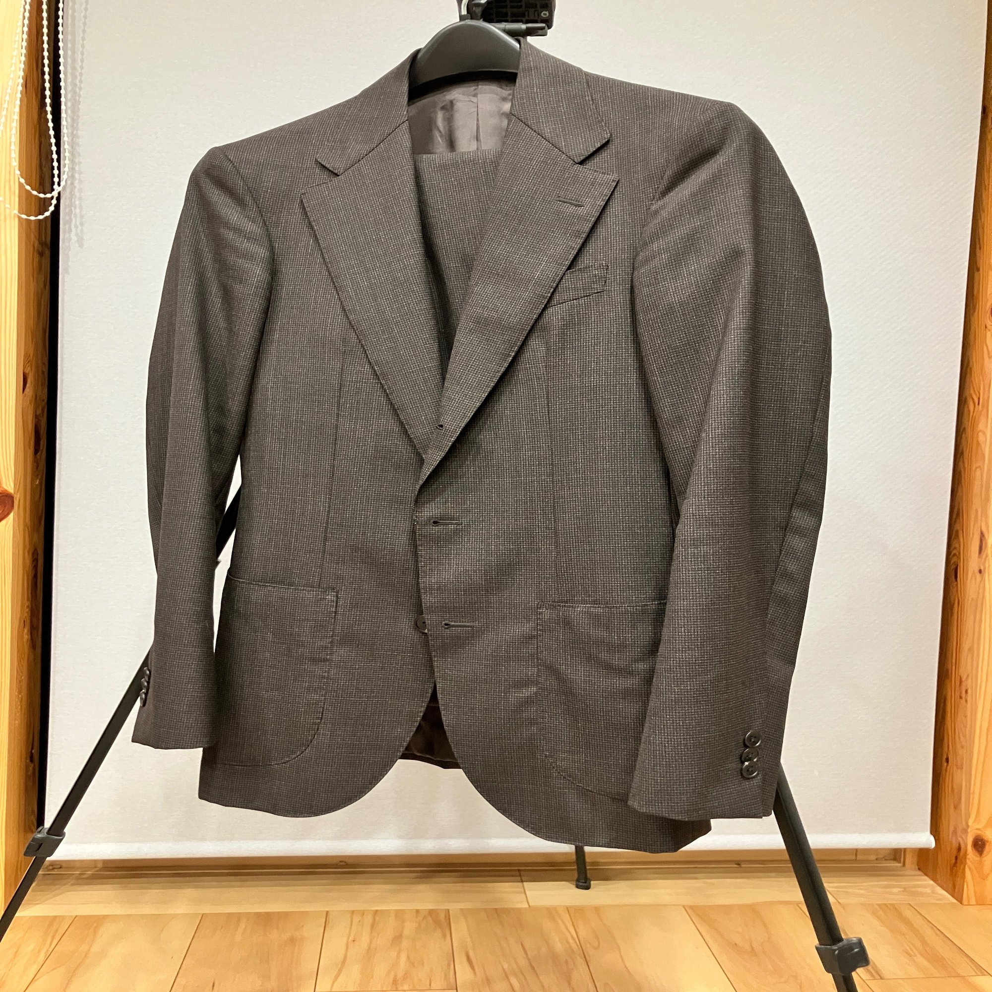 仕事着のスーツとして親愛なるbengal氏のメルカリ奉納会にて購入した。寸法を見て「これもしかしてピッタリでは?」と思って買ってみたら予想通りジャストサイズだったので、すかさずジャケットをもう一つ購入。