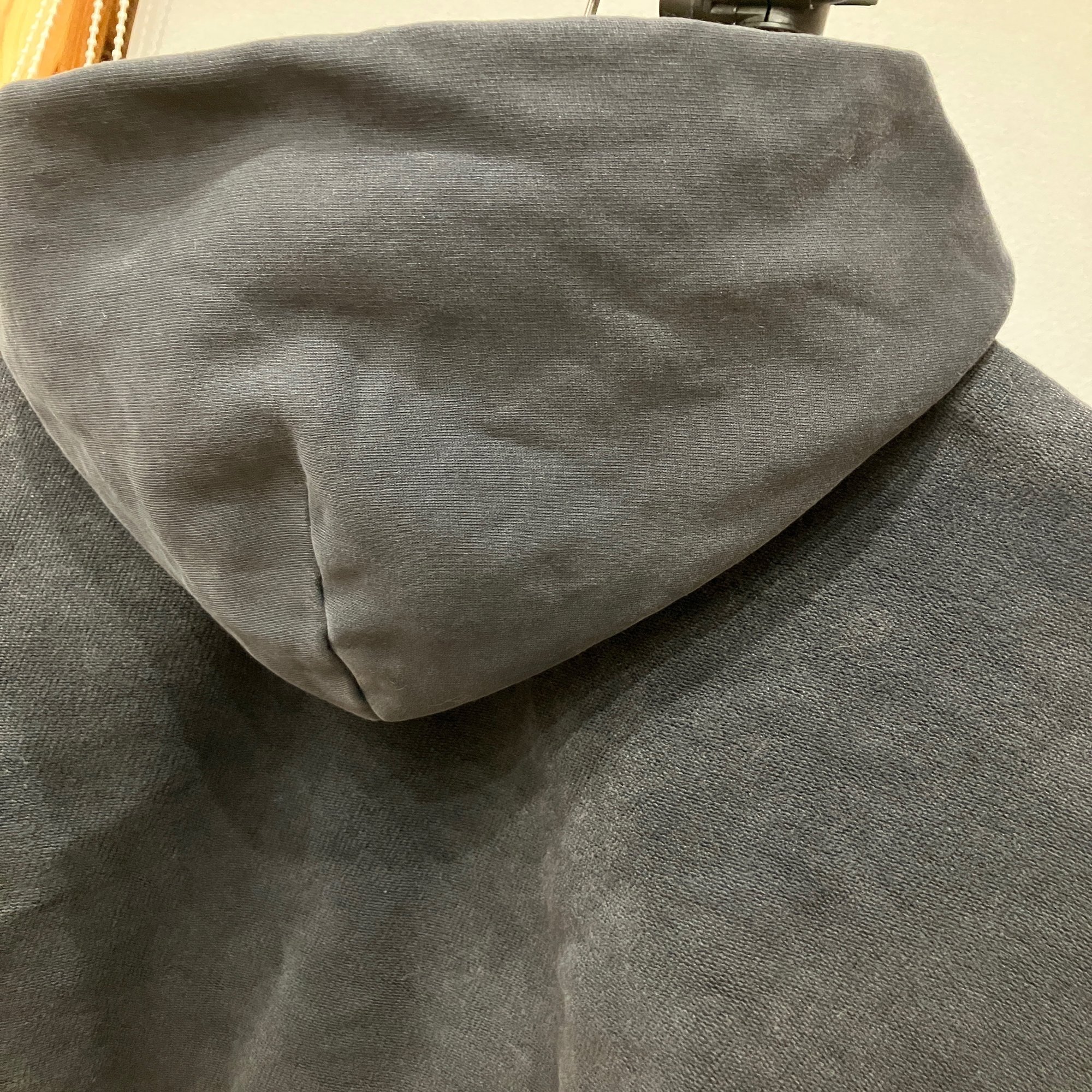 バレンシアガのフーディの宿命だが、ドルマンスリーブ程ではないものの、とにかく腕ぐりが太い。故に上に羽織るアウターの脇が引っかかりやすく、適応するアウターはかなり限定されてしまう。我が家の場合はアイアムドークのチェスターコートとモンクレールのクソデカダウン以外のアウターは無理でした。なので自ら禁じていたはずのフーディにロングアウターの合わせをせざるを得なくなってしまった。それでもバレンシアガのボンバーには行きませんよ今のところ。
