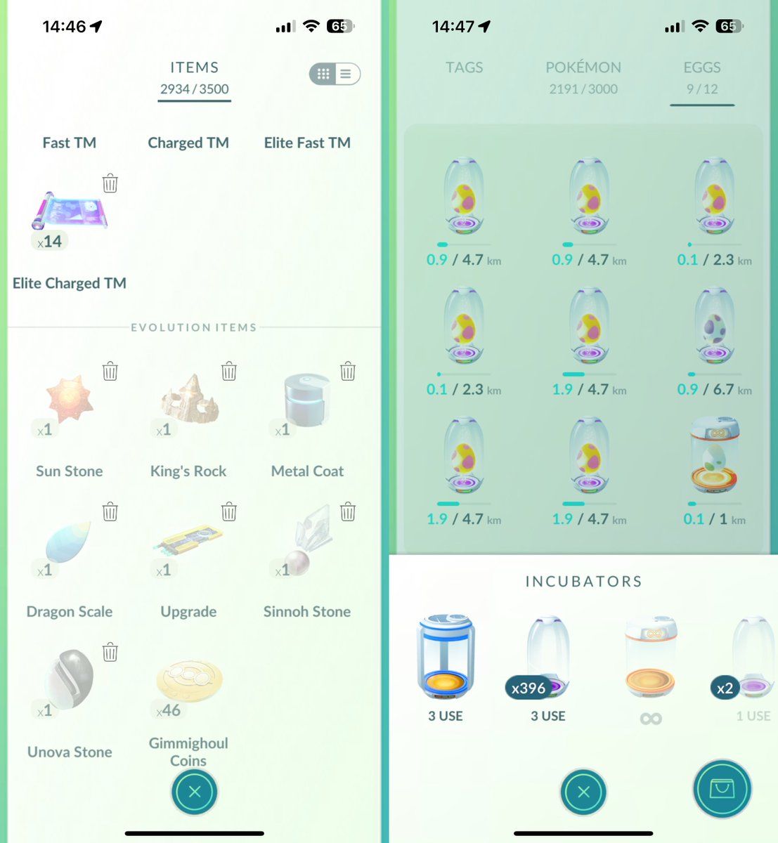 ポケモンGOバッグ紹介(無課金) ボックス3000 バッグ3500 薬30、ボール2000、きのみ20など。位置が変わらないよう不要なアイテムも1残し pic.x.com/2VSYxRSDFQ