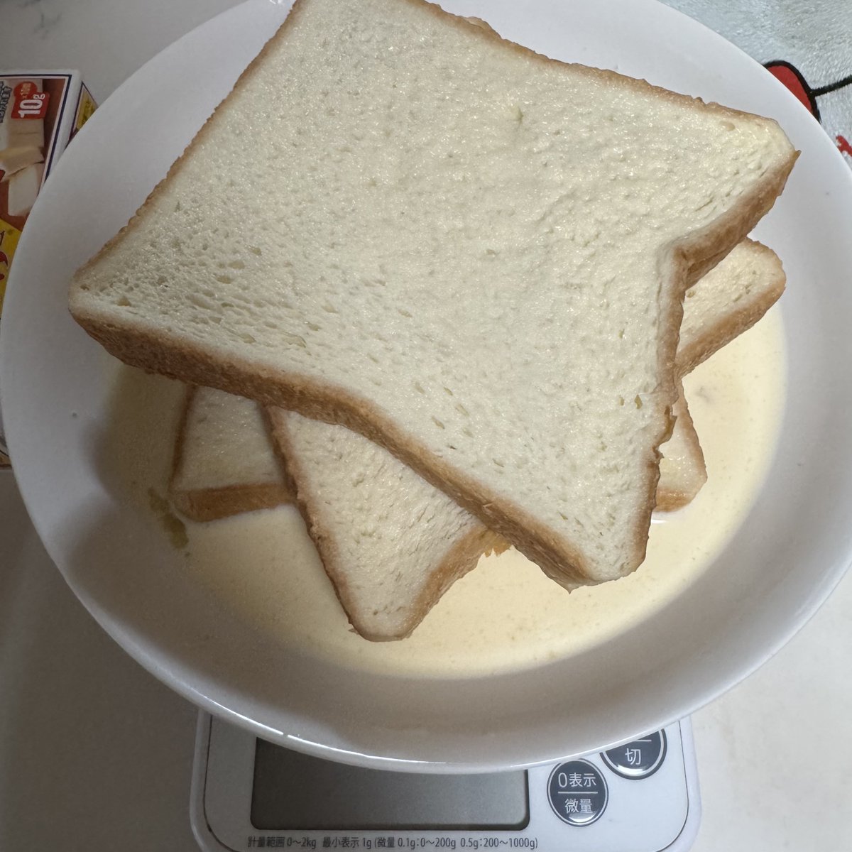 5日目 ①卵1個、牛乳200g パン浸します。平たい皿がいい ②バター溶かし、砂糖5gまぶし、弱火焼きます。 ③焦げます。 pic.x.com/XJm5jRW08n