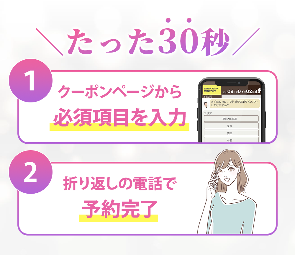 もちろん勧誘もございません。施術日ではなく、無料カウンセリングの予約先着順でクーポンが適用されますので、少しでも気になる場合はお早めにご予約くださいませ。