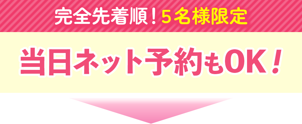 このページ限定でのご案内になります。このページから予約し、実際に来院してくださった方にのみ、この価格でご案内しております。各店舗先着5名さま限定のため、お早めのご予約を推奨しております。