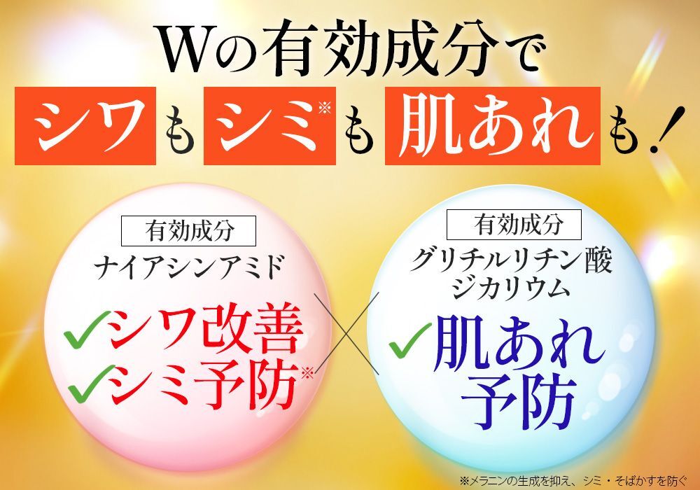 シワ改善・シミ予防*1の薬用有効成分『ナイアシンアミド』を配合し、肌の奥深く真皮層のシワまでアプローチ!肌あれ有効成分とW配合なので、一塗り*2でエイジングケア*3が完了!