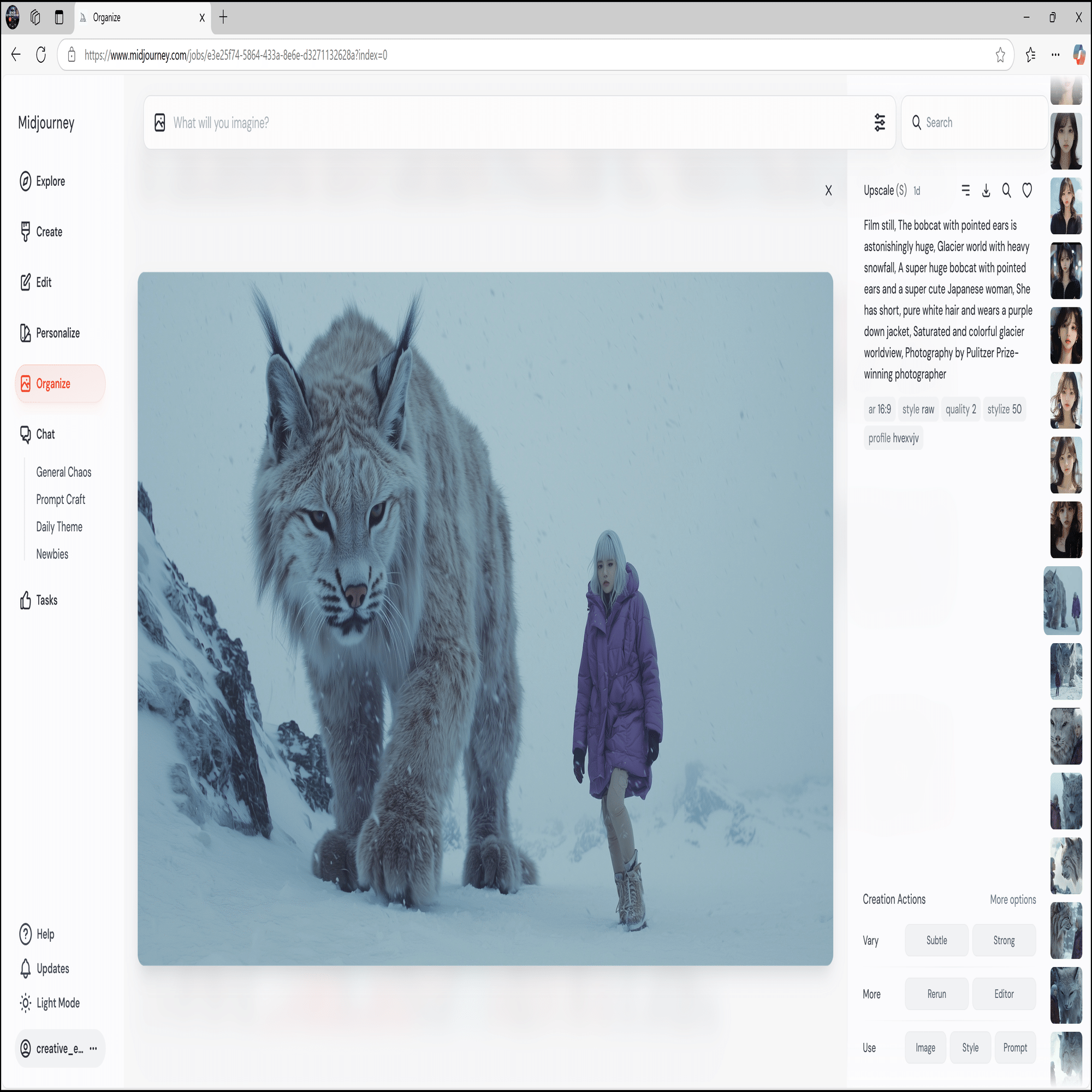film still, The bobcat with pointed ears is astonishingly huge, Glacier world with heavy snowfall, A super huge bobcat with pointed ears and a super cute young woman, She has short, pure white hair and wears a purple down jacket, Saturated and colorful glacier worldview --ar 16:9 --quality 2 --style raw --p --stylize 50 --v 6.1