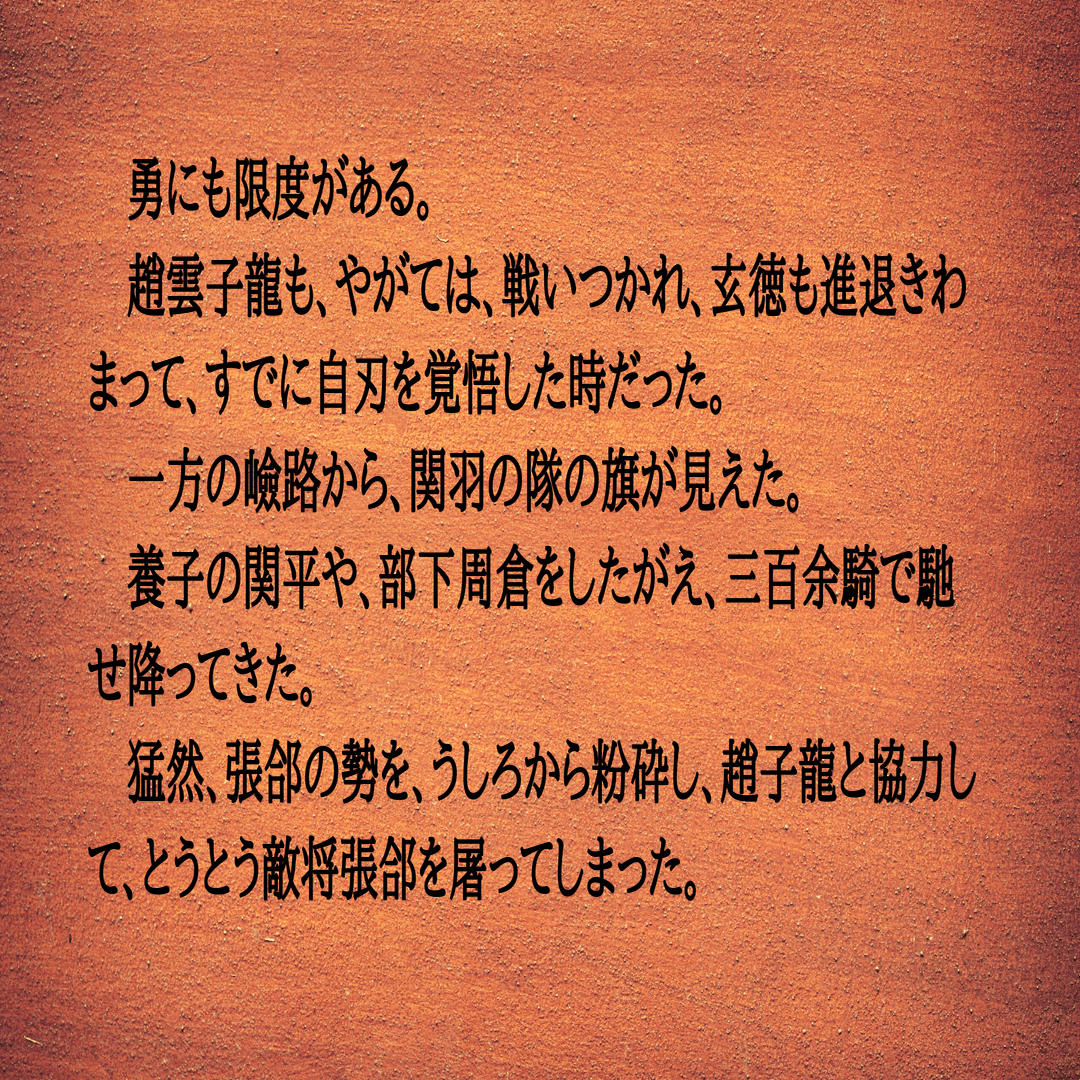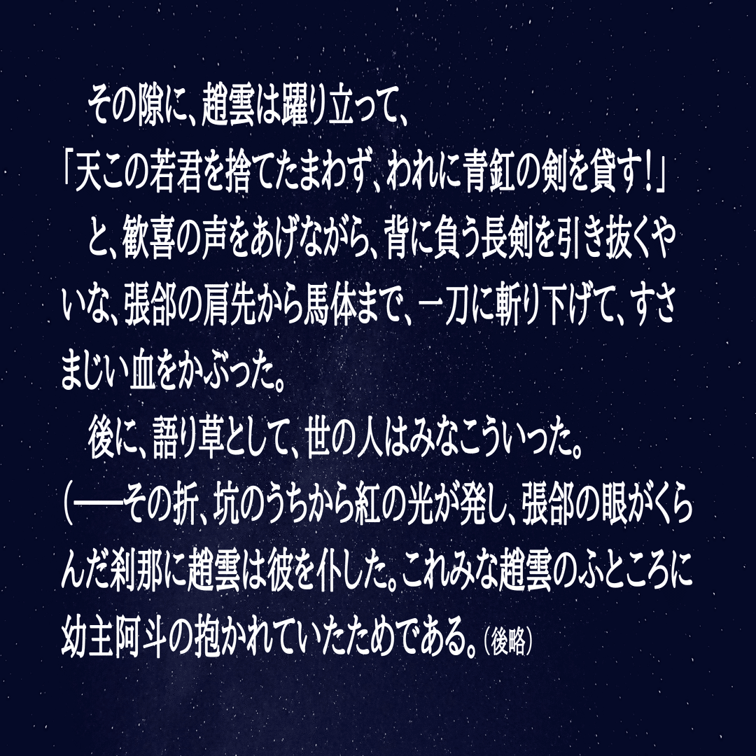 (――其折、坑のうちから紅の光が發し、張郃は眼が晦んで刹那に趙雲を逸し了つた。これみな趙雲のふところに幼主阿斗の抱かれてゐた爲である。(後略)