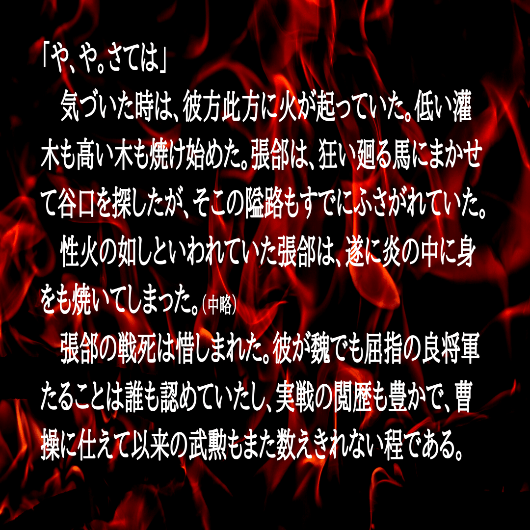 張郃のこととみて間違いないでしょう。どうも誤って戦死させてしまった自覚はあったようです。また傍証として、戦後間もない時期に大日本雄弁会講談社(現・講談社)から刊行されたバージョンでは、実は2度目の戦死の場面が改稿されて張郃は生き延びているのです。