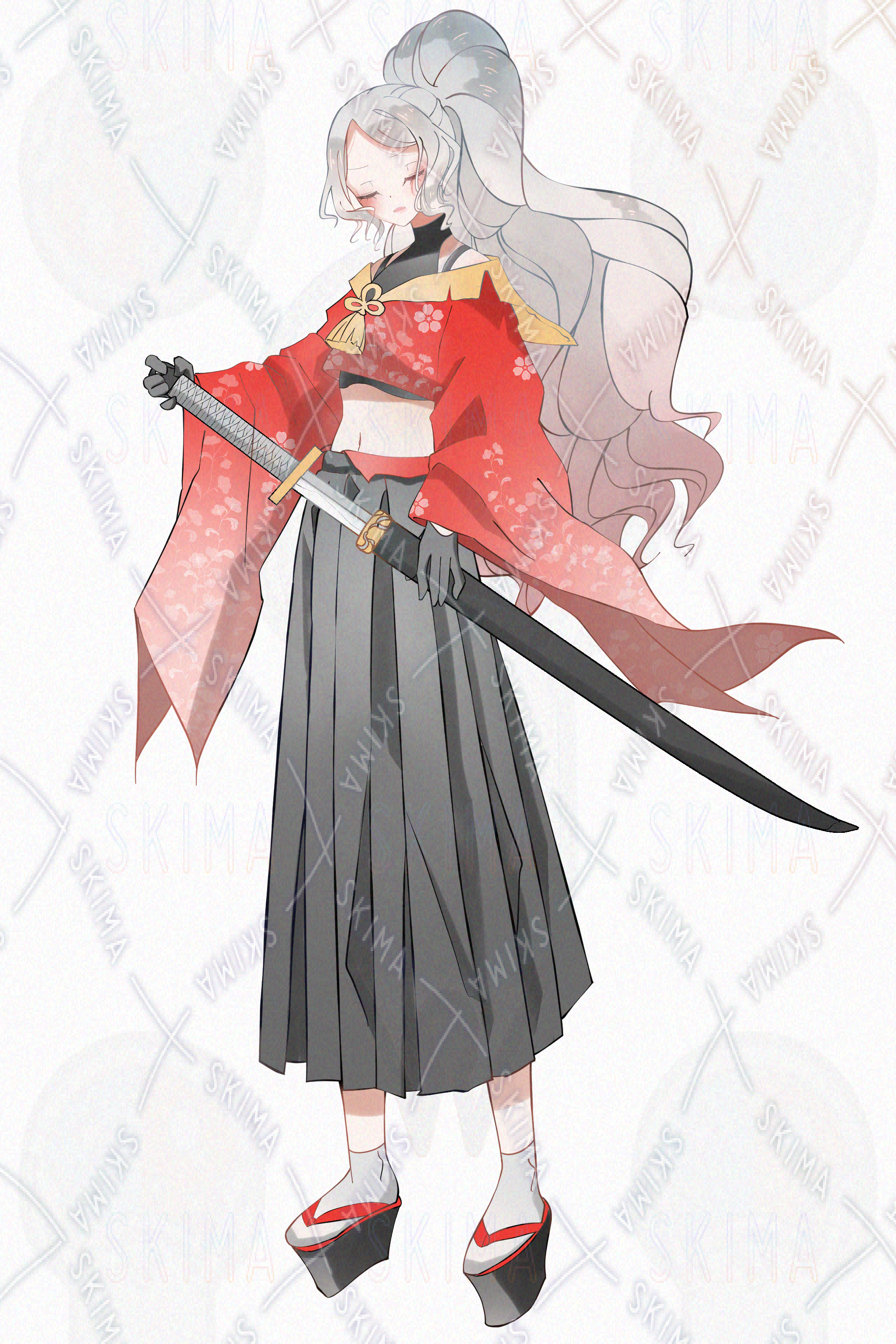 和風・着物・侍・剣・赤色・黒色・長い髪の毛・ポニーテール・武士