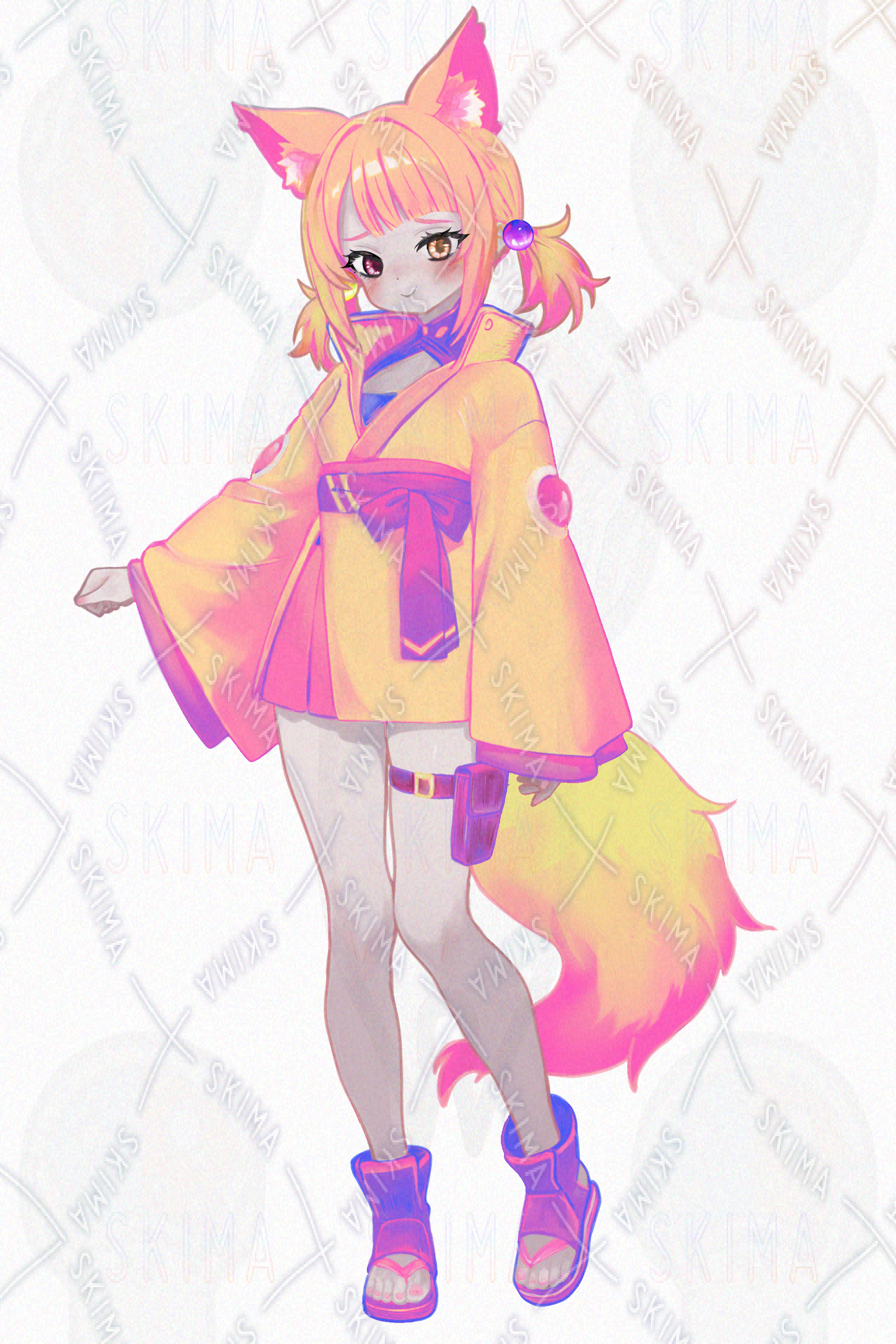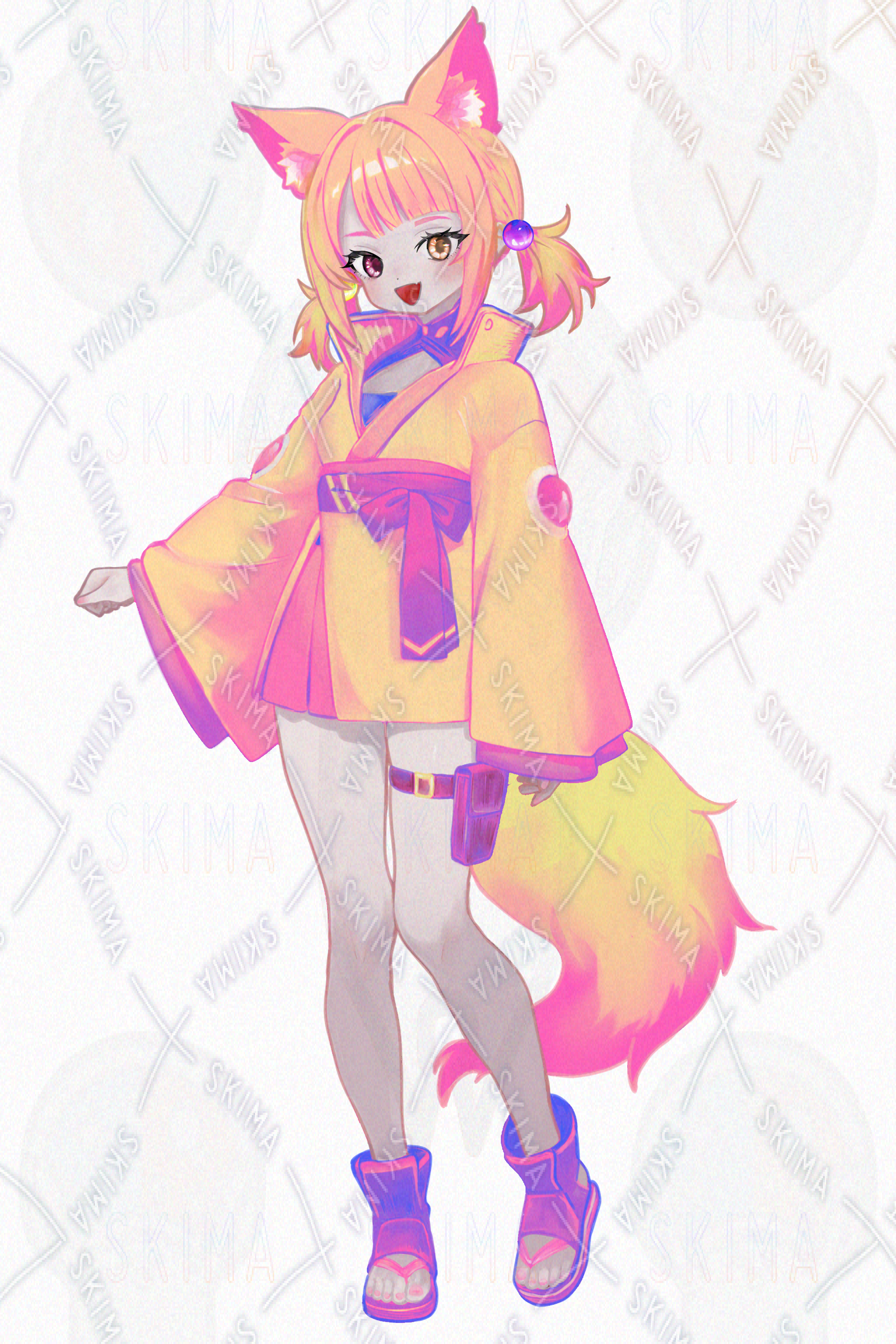 少女 女の子 女性 サイバーパンク 狐 地雷系 オッドアイ 可愛い エモい ツインテール 和服 稲荷 神様 和風 獣耳 獣人