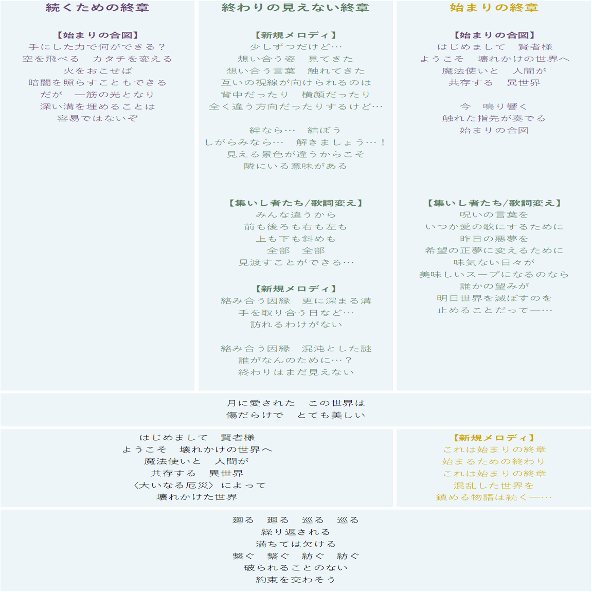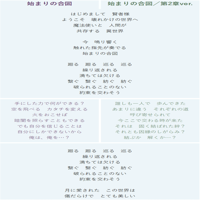 メロディは「集いし者たち」の「みんな違うけど~」のメロディに近いのですが、上へ伸びる音がクライマックスを教えてくれていて……。でも「始まるための終わり」と歌ってくれていて……。しかも、「混沌とした世界を鎮める」て祝祭じゃん!!!!!!!!!!!!!!!!!!!!!!!!!!!!!!!!!!! っていう。優しい。