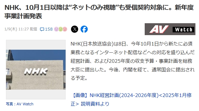NHK(日本放送協会)は8日、今年10月1日から新たに必須業務となるインターネット配信などへの対応を盛り込んだ経営計画、および2025年度の収支予算・事業計画を総務大臣に提出した。今後、内閣を経て、通常国会に提出される予定。