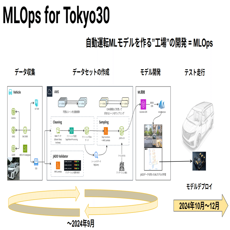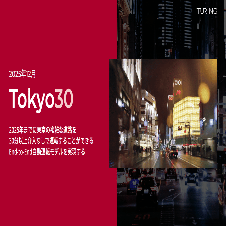 Tokyo30は、2025年12月までに自社で集めた走行データで学習したEnd-to-end自動運転モデルを実現し、東京都内の道路を30分介入なしで自動運転することを目標としています。