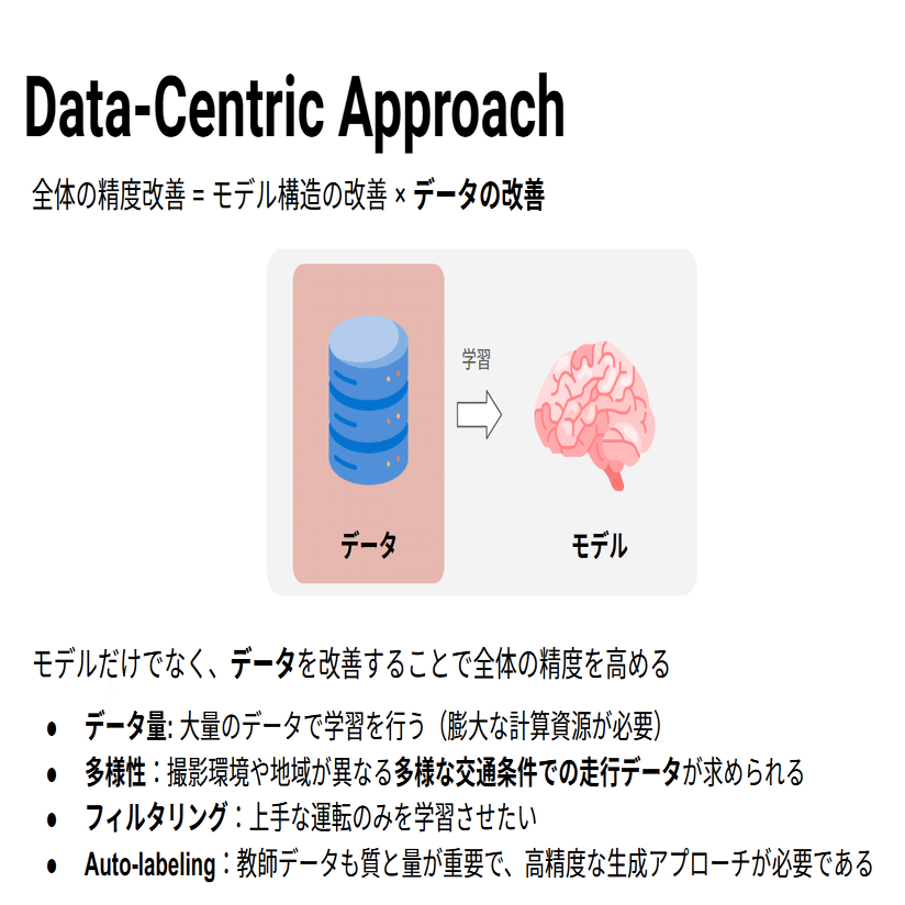 我々はEnd-to-end自動運転を実現するため、「Data-Centric」というアプローチをとっています。これはAIモデルそのものより、それを学習するためのデータを改善していくというものです。
