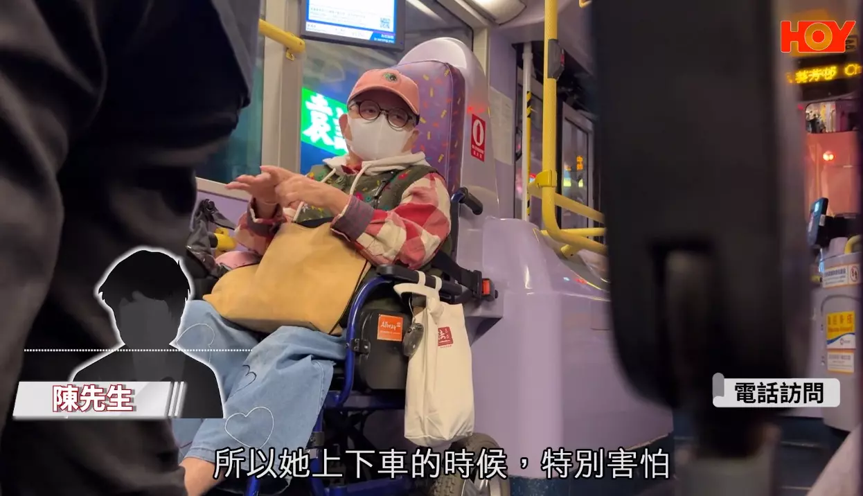 「驚㗎,真係好驚,因為(斜板)咁直,咁樣衝落去,一時控制唔到,個人會一下衝出嚟、跌出嚟。其實好危險、好危險。」72歲的陳婆婆表示,為了減低風險,輪椅上落巴士時,車長一定要將車身降低,有時遇到司機未有降低車身,會令她上落巴士有危險。