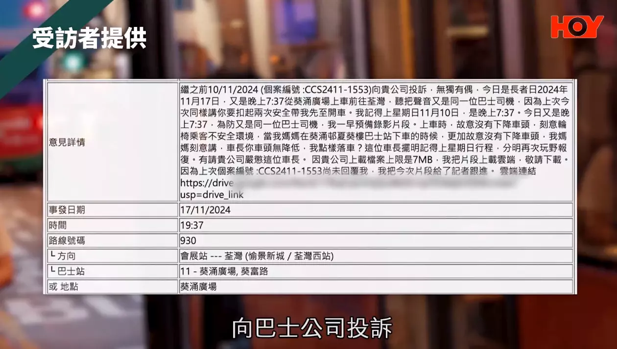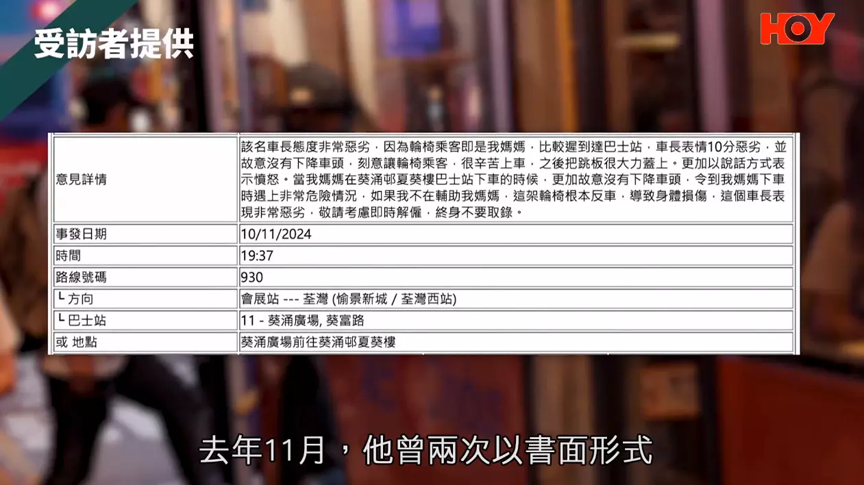 翻查資料,去年11月底曾有輪椅使用者上巴士時,懷疑輪椅翻側,倒地受傷。陳婆婆認為,經過咁多次咁驚險(嘅情況),希望啲車長唔好以為唔降低車身都唔緊要,一定要降低車身。」