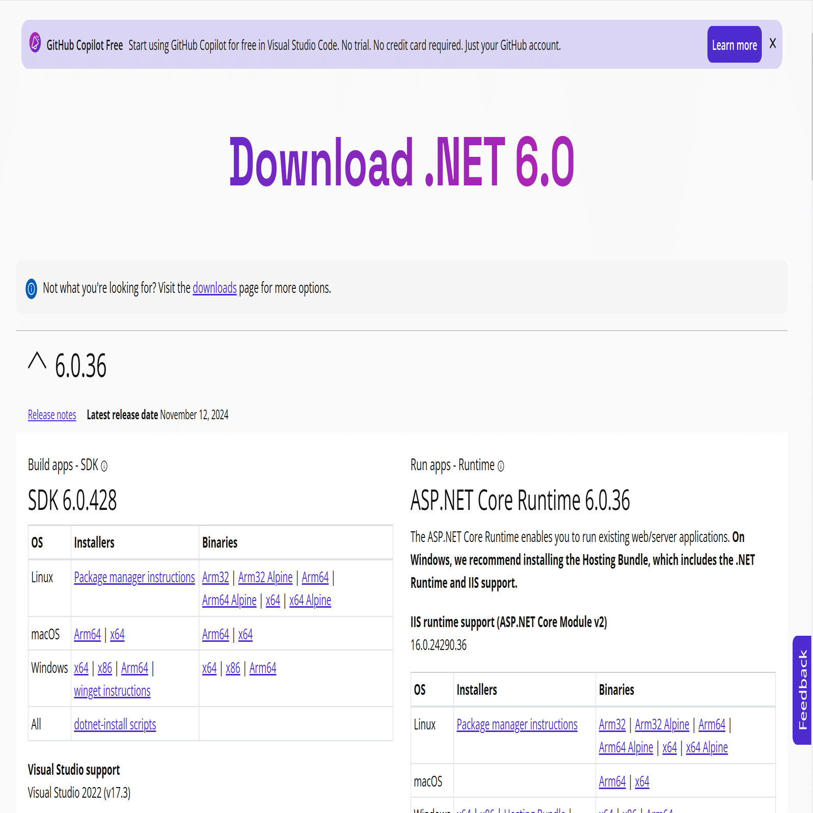 同じページ、もしくは .NET の公式サイトなどから .NET 6.0 をダウンロードします( https://dotnet.microsoft.com/en-us/download/dotnet/6.0#runtime-6.0.15 )。