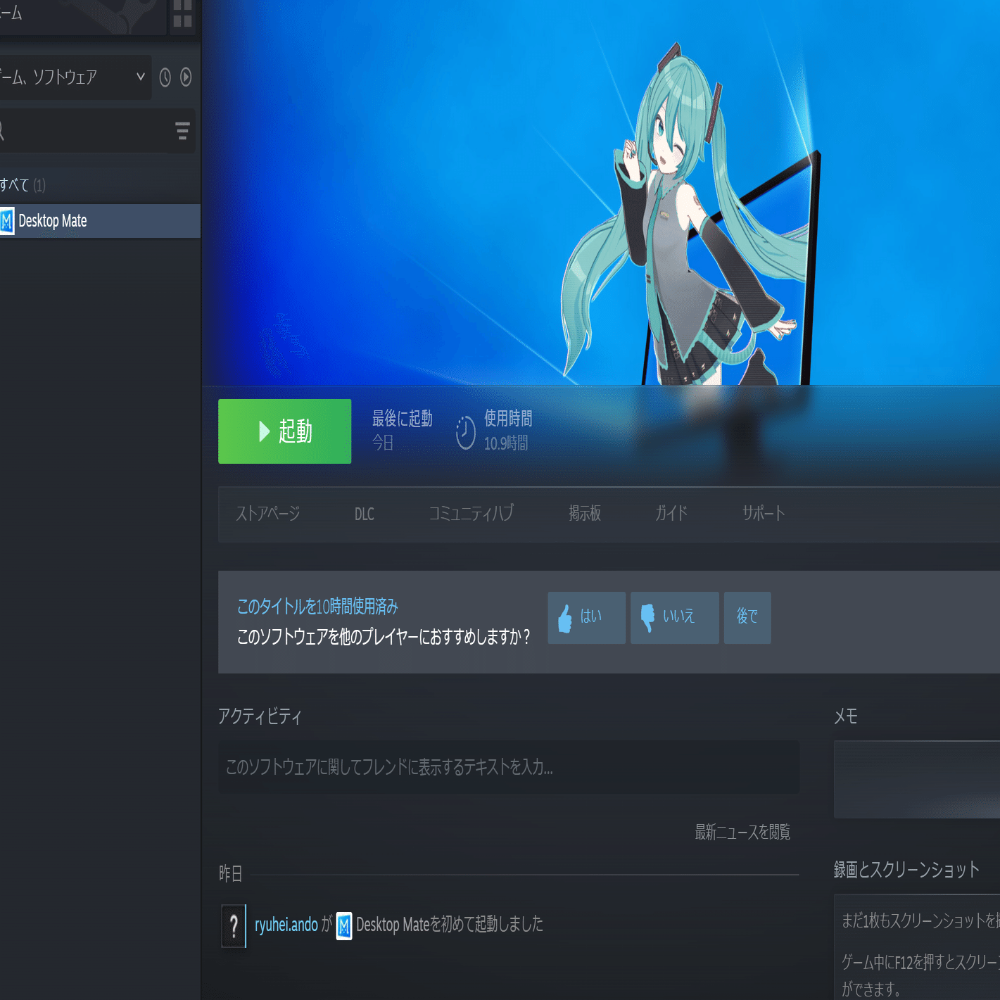 Steam を起動し、ストアやライブラリから DesktopMate を検索・インストールします。